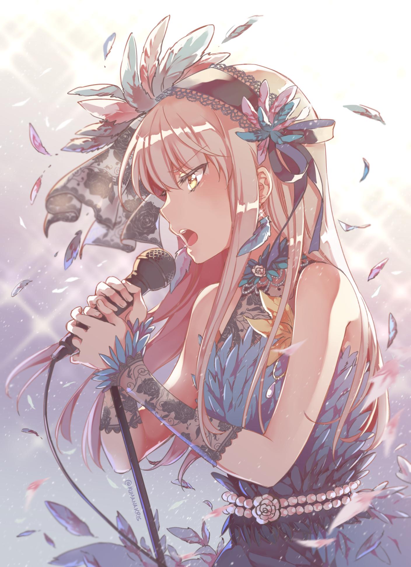 1girl ana_c._sanchez bang_dream! bang_dream!_girls_band_party! bare_shoulders blonde_hair character_request commentary copyright_request english_commentary feathers highres holding holding_microphone long_hair microphone microphone_stand solo straight_hair teeth upper_body upper_teeth_only yellow_eyes