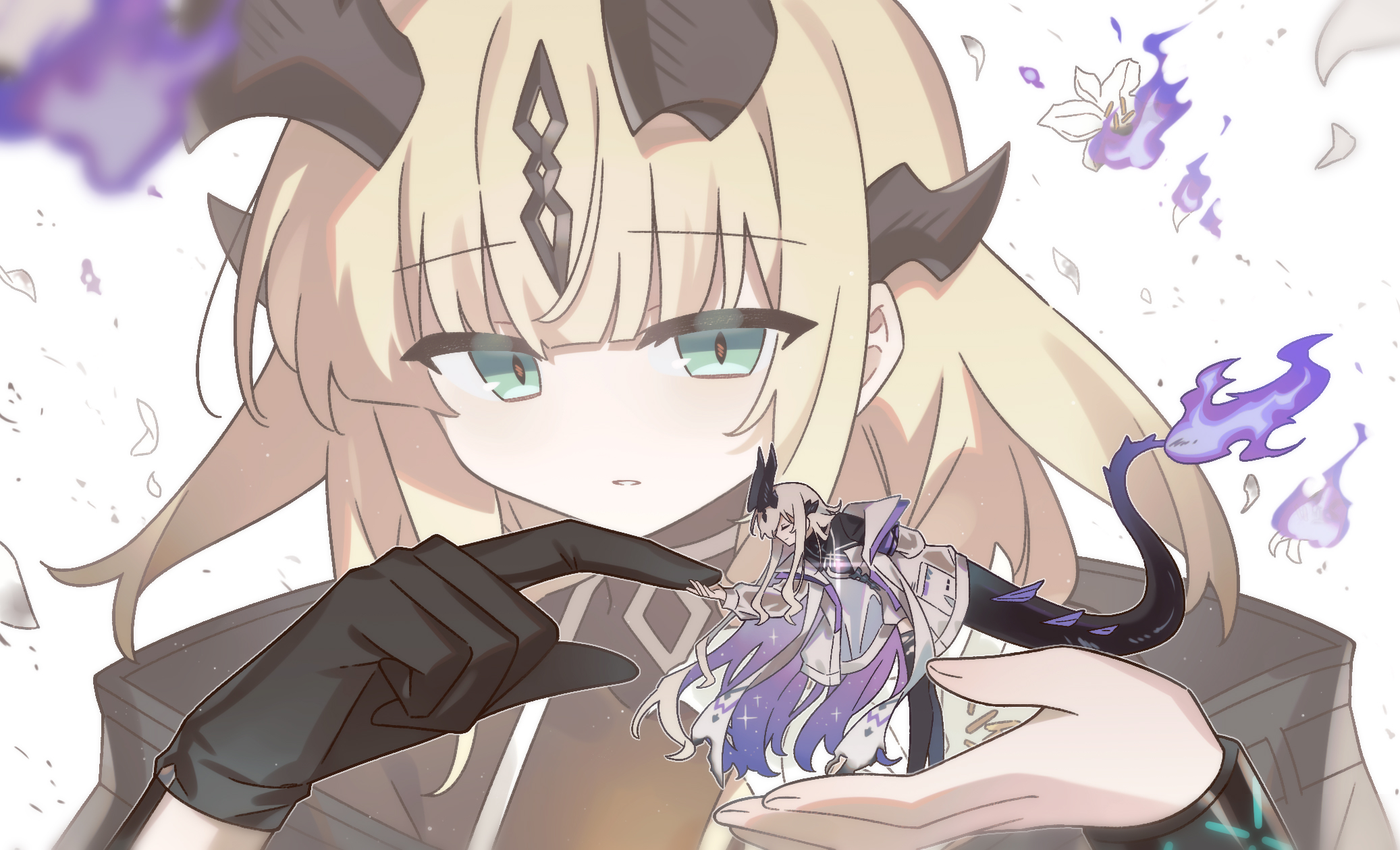 2girls arknights black_gloves black_horns blonde_hair bowing closed_eyes dragon_girl dragon_horns dragon_tail dress fire flame-tipped_tail flower gloves highres holding holding_mini_person horns infection_monitor_(arknights) isikishoku_akn light_in_heart lily_(flower) long_hair long_sleeves medium_hair mini_person multiple_girls multiple_horns necrass_(arknights) parted_lips reed_(arknights) reed_the_flame_shadow_(arknights) single_glove tail very_long_hair white_background white_dress white_flower