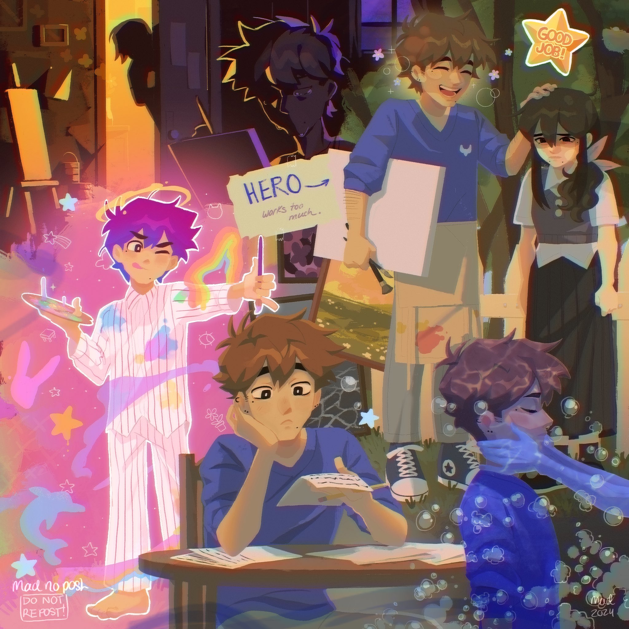 1girl 2024 3boys alternate_costume alternate_eye_color alternate_hair_color alternate_hairstyle alternate_skin_color alternate_universe antenna_hair apron arrow_(symbol) artist_name aubrey_(faraway)_(omori) aubrey_(omori) barefoot black_eyes black_hair black_skirt black_sweater_vest blue_shoes blue_sweater brothers brown_eyes brown_hair chair character_name closed_eyes collared_shirt crying dark-skinned_male dark_skin double-parted_bangs ear_piercing easel grey_pants hair_between_eyes hair_ribbon headpat hero_(faraway)_(omori) hero_(headspace)_(omori) hero_(omori) highres holding holding_paint_palette holding_paintbrush holding_paper holding_pencil indoors kel_(faraway)_(omori) kel_(omori) long_hair long_skirt long_sleeves low_ponytail madnopost mole mole_under_eye mole_under_mouth multiple_boys omori one_eye_closed paint_on_clothes paint_palette paintbrush pants paper pencil piercing pink_ribbon pleated_skirt ponytail purple_hair ribbon shirt shoes short_hair short_sleeves siblings sitting skirt sneakers standing sweater sweater_vest table white_apron white_shirt window