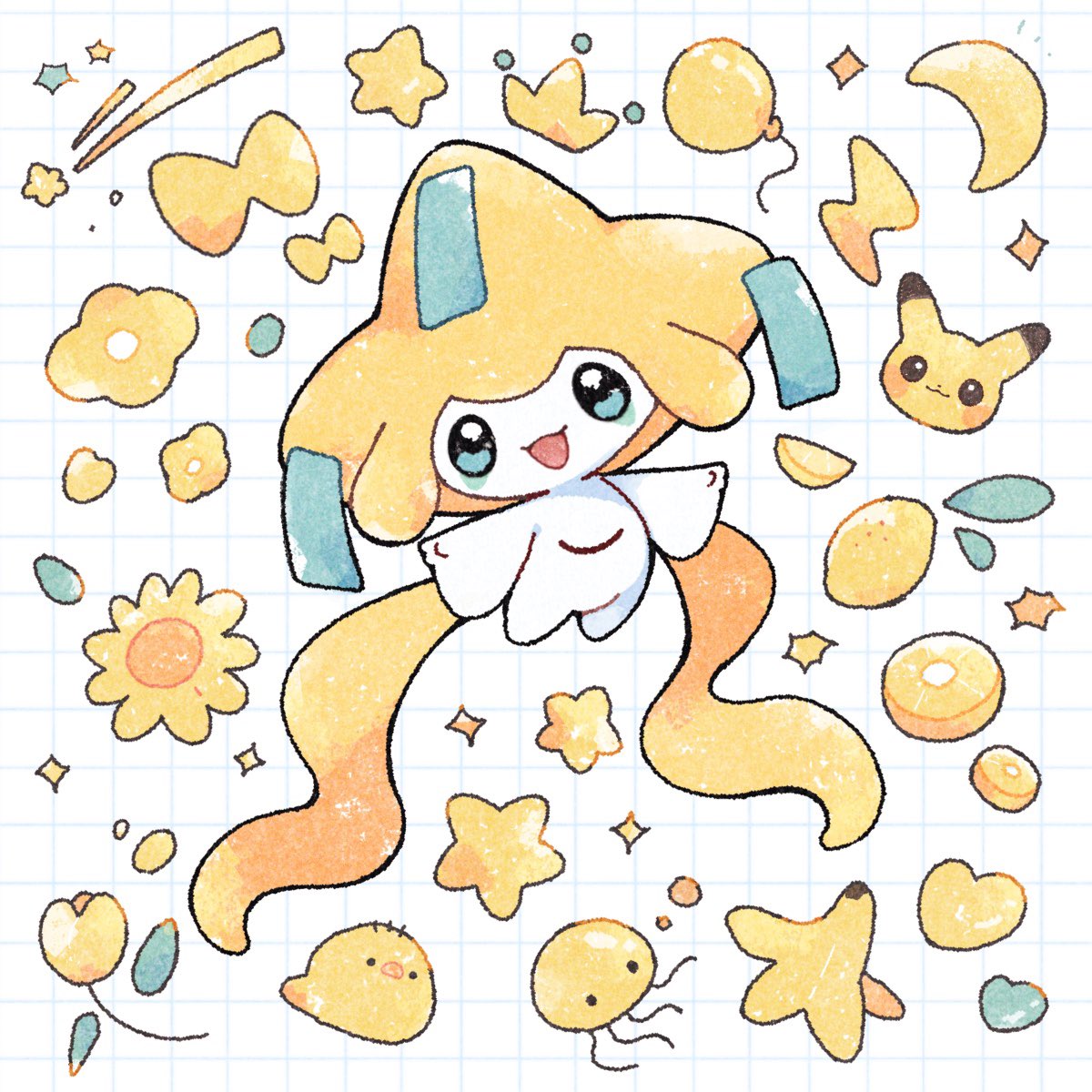 appyon_(archangel_ayp) aqua_eyes balloon banana_peel bird commentary crescent crown duck flower food fruit full_body gen_1_pokemon gen_3_pokemon heart highres jirachi legendary_pokemon lemon lemon_slice lightning_bolt_symbol mythical_pokemon nintendo no_humans octopus open_mouth pikachu pokemon pokemon_(creature) pokemon_focus smile star_(symbol) untranslatable_commentary