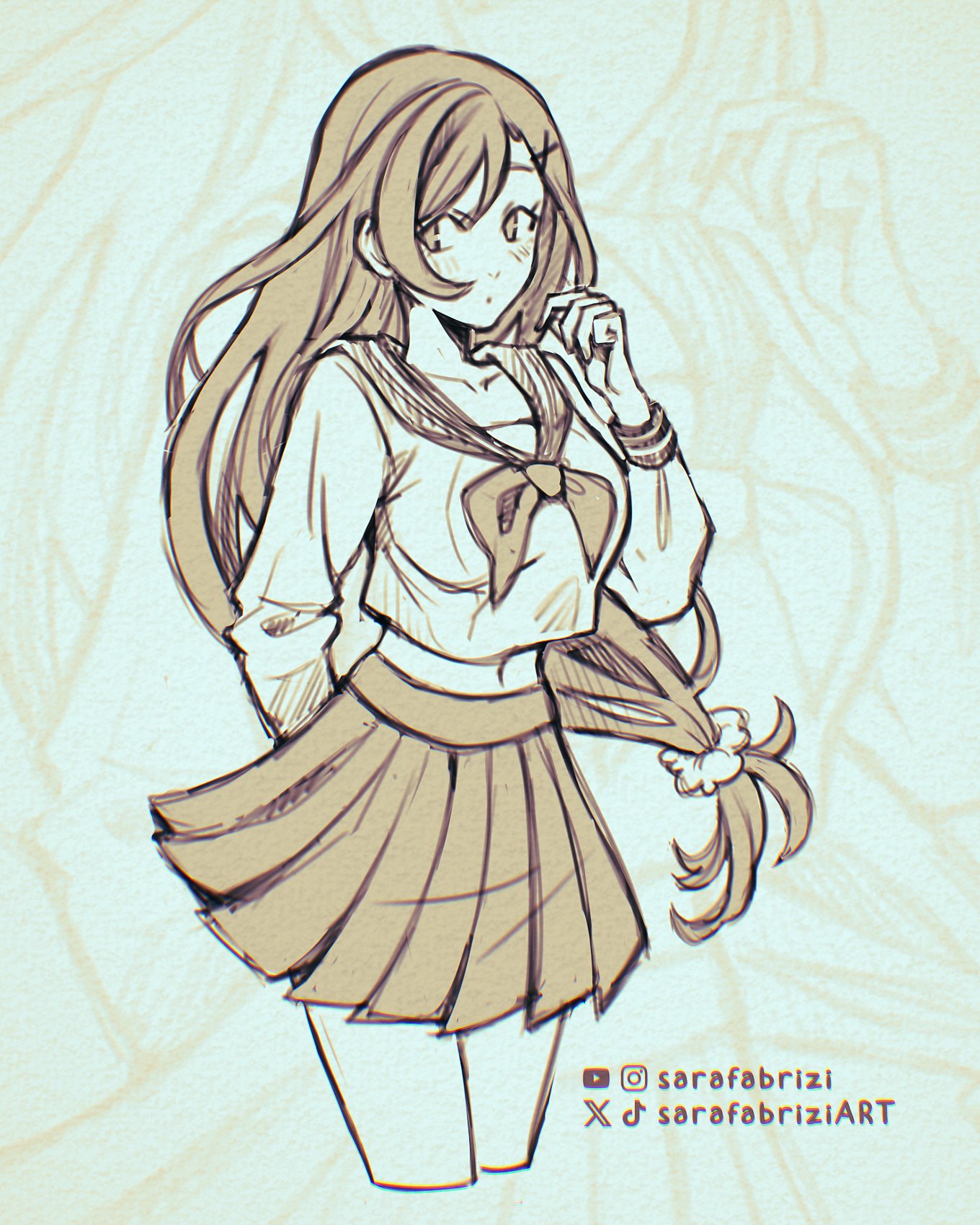 1girl arm_behind_back artist_name blush breasts closed_mouth collarbone commentary cowboy_shot cropped_legs english_commentary final_fantasy final_fantasy_vii final_fantasy_vii:_ever_crisis hair_ornament hair_scrunchie hairclip highres large_breasts long_hair looking_at_viewer low-tied_long_hair midriff_peek miniskirt monochrome navel neckerchief official_alternate_costume pleated_skirt sailor_collar sarafabrizi school_uniform scrunchie serafuku skirt solo tifa_lockhart tifa_lockhart_(midgard_seventh_high_school) twitter_username
