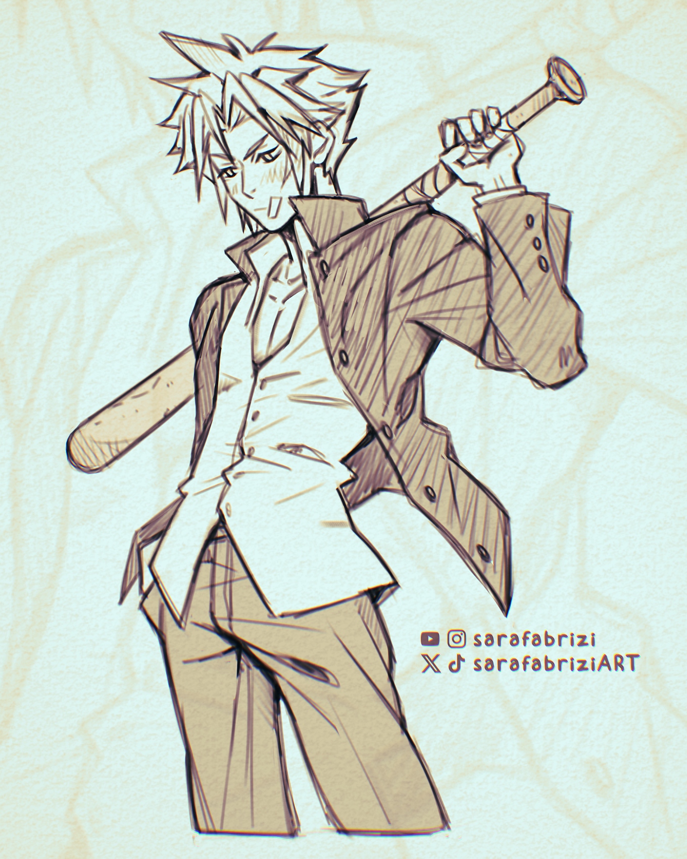 1boy artist_name bandaid bandaid_on_cheek bandaid_on_face baseball_bat blush closed_mouth cloud_strife cloud_strife_(midgard_seventh_high_school) collarbone commentary cowboy_shot cropped_legs delinquent english_commentary final_fantasy final_fantasy_vii final_fantasy_vii:_ever_crisis gakuran hand_in_pocket highres holding holding_baseball_bat jacket looking_down male_focus monochrome official_alternate_costume open_clothes open_jacket pants sarafabrizi school_uniform shirt short_hair solo spiked_hair twitter_username