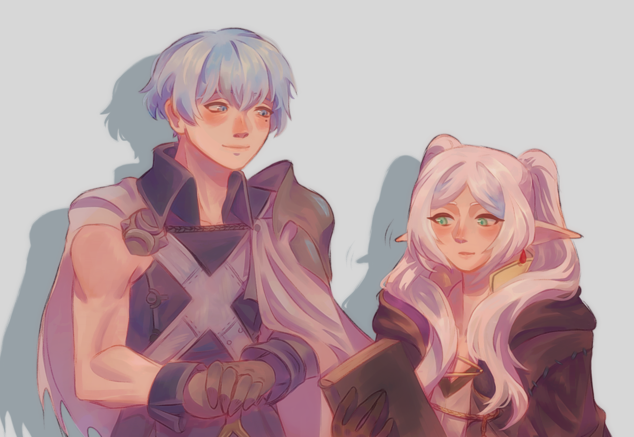 1boy 1girl armor black_gloves black_robe blue_hair blue_shirt book cape chrom_(fire_emblem) chrom_(fire_emblem)_(cosplay) closed_mouth cosplay earrings elf female_robin_(fire_emblem) female_robin_(fire_emblem)_(cosplay) fire_emblem fire_emblem_awakening frieren gloves green_eyes harmorii highres himmel_(sousou_no_frieren) holding holding_book hooded_robe jewelry long_hair mole mole_under_eye nintendo parted_bangs pointy_ears robe shadow shirt short_hair shoulder_armor single_sleeve smile sousou_no_frieren twintails white_cape white_hair