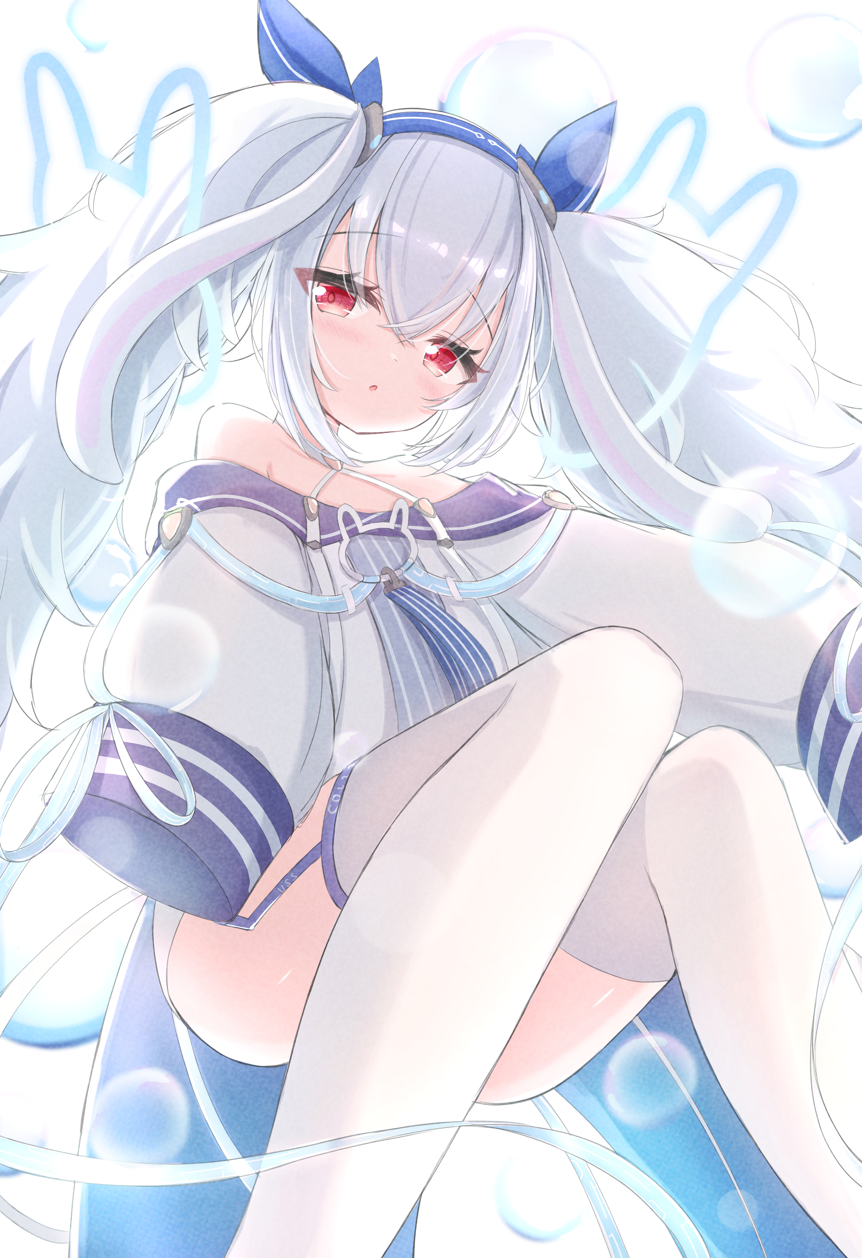 1girl absurdres azur_lane bare_shoulders bubble grey_hair hair_ornament highres laffey_(azur_lane) laffey_ii_(azur_lane) long_sleeves looking_at_viewer mashiro281 red_eyes twintails white_hair