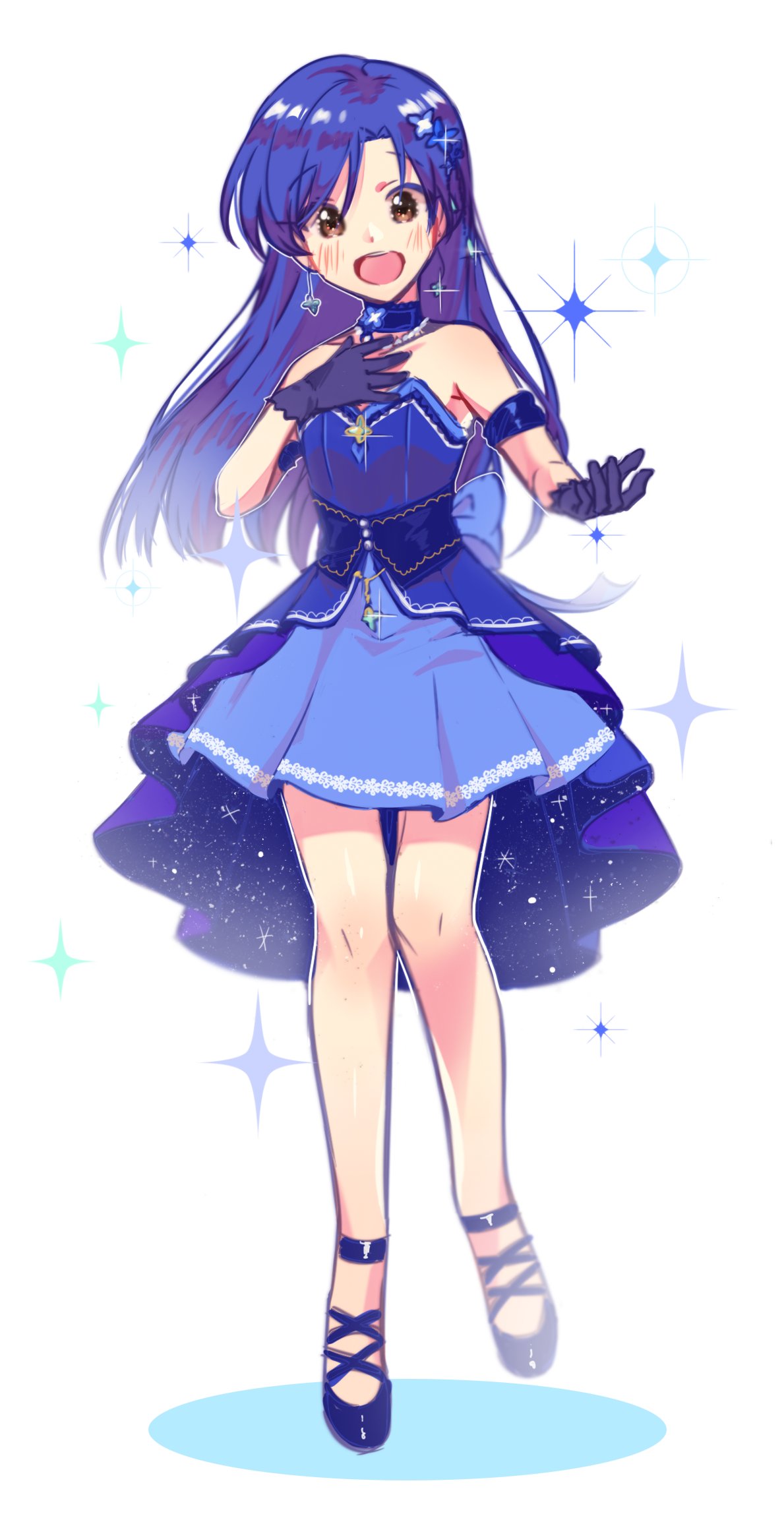 1girl :d blue_choker blue_dress blue_gloves blue_hair blush brown_eyes choker dress earrings full_body gloves hair_ornament hand_on_own_chest highres idolmaster idolmaster_(classic) idolmaster_million_live! idolmaster_million_live!_theater_days jewelry kisaragi_chihaya kisaragi_chihaya_(brilliant_diva) long_hair looking_at_viewer lunim_(roo_0_0) necklace official_alternate_costume open_mouth simple_background smile solo sparkle standing strapless strapless_dress white_background