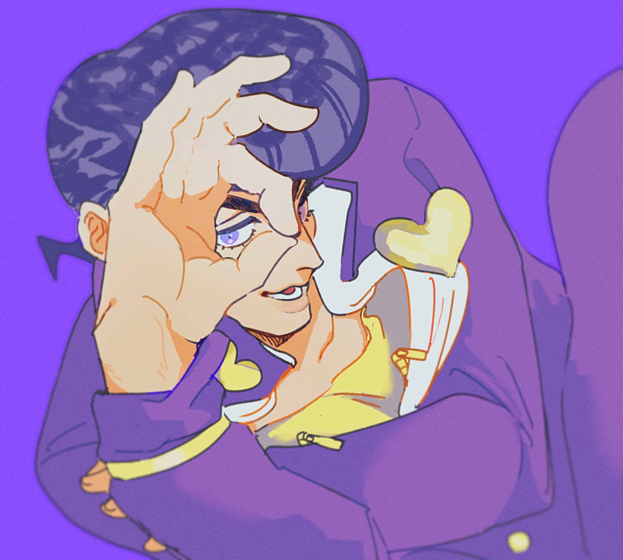 1boy arm_up black_hair blue_eyes commentary diamond_wa_kudakenai dutch_angle gakuran heart higashikata_josuke jacket jojo_no_kimyou_na_bouken long_sleeves lower_eyelashes_only lower_teeth_only male_focus ok_sign ok_sign_over_eye open_mouth pants pompadour purple_background purple_jacket purple_pants school_uniform shirt simple_background solo teeth tirauraja yellow_shirt zipper_pull_tab