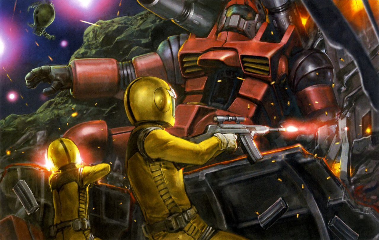 a_baoa_qu aiming artist_request assault_rifle asteroid astronaut battle blue_visor cable cannon damaged debris firing gun guncannon gundam gundam_perfect_file hayato_kobayashi kai_shiden machinery mecha mecha_pilot_suit mobile_suit mobile_suit_gundam normal_suit_(gundam) official_art painting_(medium) realistic rifle robot scan scene_reference science_fiction scope severed_head soldier traditional_media weapon when_you_see_it wreckage zaku_ii