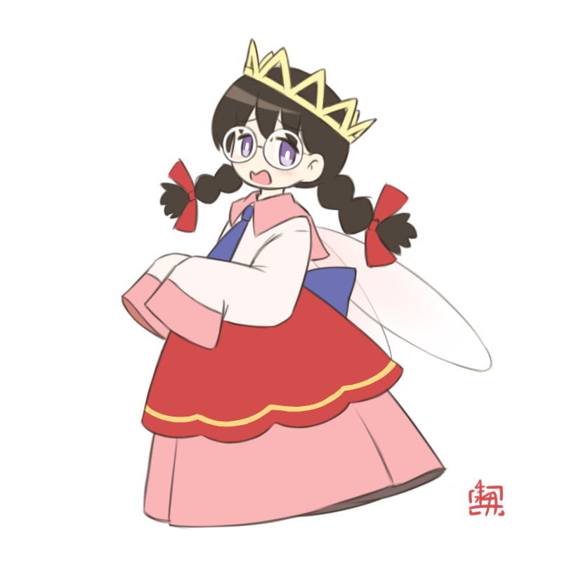 1girl black_hair blush bow crown fairy fairy_wings hair_bow kirby_(series) kirby_64 kitagawa_suigetsu long_hair long_skirt nintendo pink_skirt purple_eyes red_bow ripple_star_queen simple_background skirt sleeves_past_fingers sleeves_past_wrists white_background wings