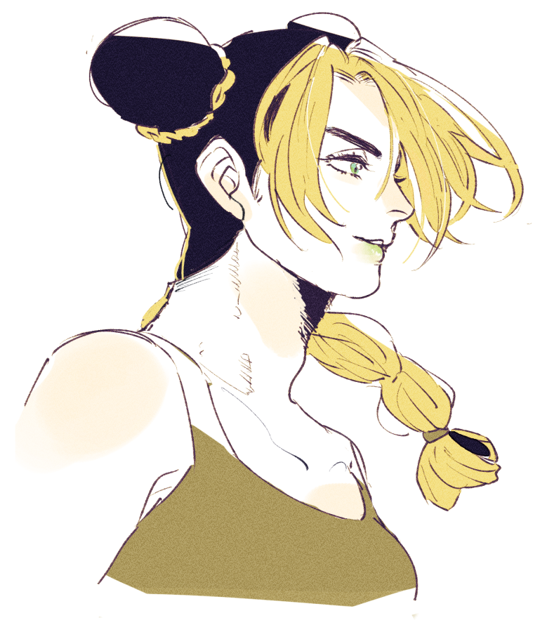 1girl bare_shoulders blue_eyes braid brown_shirt collarbone commentary_request cropped_torso double_bun eyelashes from_side hair_bun jojo_no_kimyou_na_bouken kuujou_jolyne looking_ahead multicolored_hair parted_lips profile shirt simple_background single_braid smile solo stone_ocean tank_top tirauraja two-tone_hair white_background