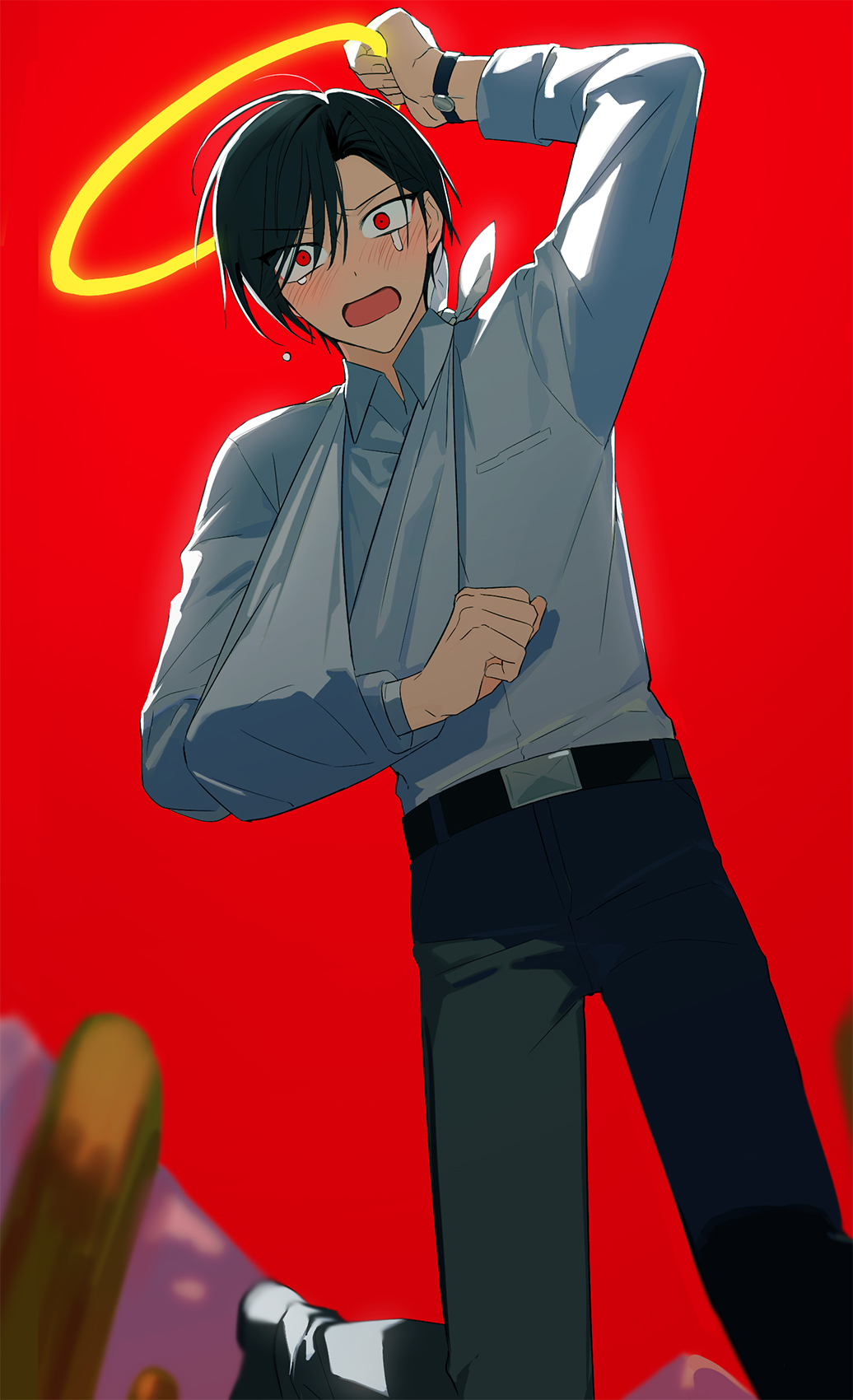 1boy ariake_(ooe) belt black_belt black_hair black_pants blush collared_shirt halo highres llikothcihw long_sleeves looking_at_viewer male_focus ooe_(game) open_mouth pants red_background red_eyes shirt short_hair simple_background solo tears watch white_shirt wristwatch