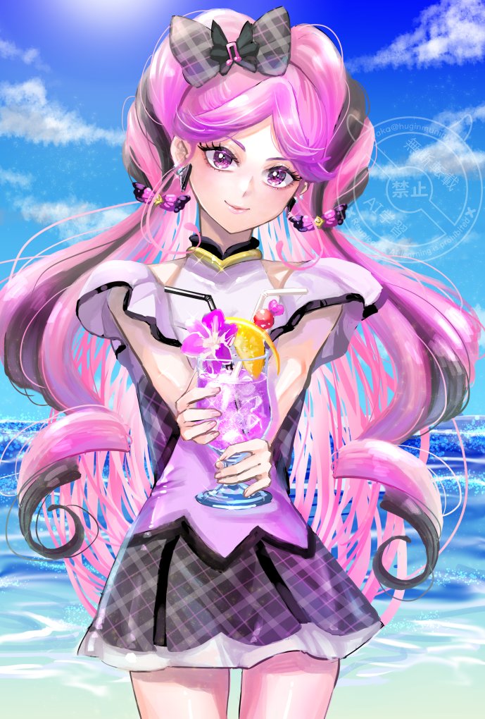 1girl bare_arms bare_legs bare_shoulders beach black_hair blue_sky braid cherry choker cloud cloudy_sky cup cure_kiss drink drinking_straw earrings flower food fortissimo fruit gingham_one-piece_swimsuit gradient_hair hair_ornament hair_ribbon hair_tie hibiscus holding holding_cup holding_drink ice ice_cube jewelry juice kimi_to_idol_precure lemon lemon_slice long_hair looking_at_viewer tanaka_meron meroron_(precure) multicolored_hair multiple_earrings musical_note musical_note_hair_ornament ocean one-piece_swimsuit parted_bangs pink_hair precure puffy_sleeves purple_eyes purple_one-piece_swimsuit ribbon sky solo solo_focus summer sunlight swimsuit twin_braids twintails upper_body very_long_hair waka_(negronoir) watermark