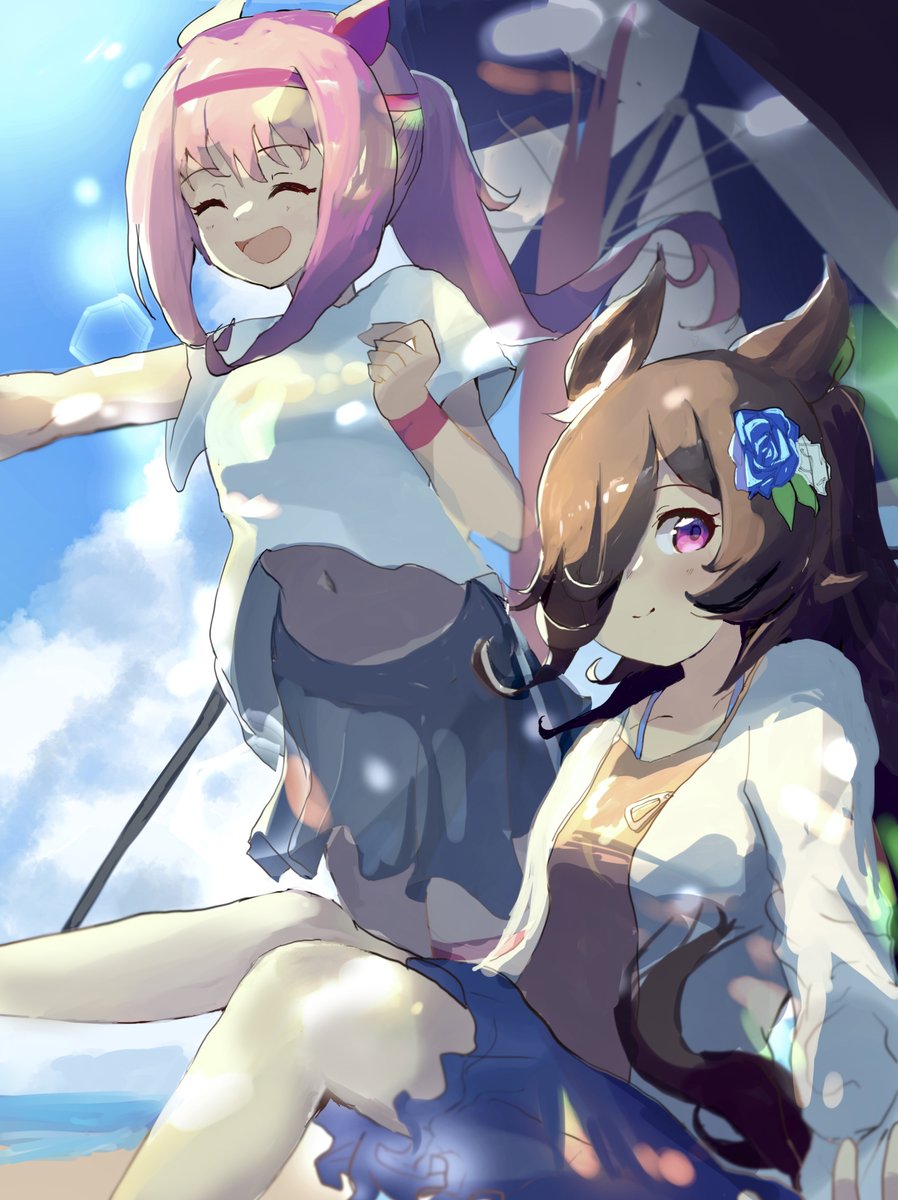 2girls alternate_costume animal_ears beach blue_flower blue_rose blue_skirt blue_sky blush brown_hair closed_eyes closed_mouth ear_covers flower hair_flower hair_ornament hair_over_one_eye hairband haru_urara_(umamusume) headband highres horse_ears horse_girl horse_tail jacket long_hair looking_at_viewer multiple_girls navel ocean open_clothes open_jacket open_mouth outdoors pink_hair pink_headband ponytail purple_eyes red_headband rice_shower_(umamusume) rose shirt skirt sky smile stomach swimsuit swimsuit_under_clothes tail takinii umamusume umbrella water white_jacket white_shirt wristband
