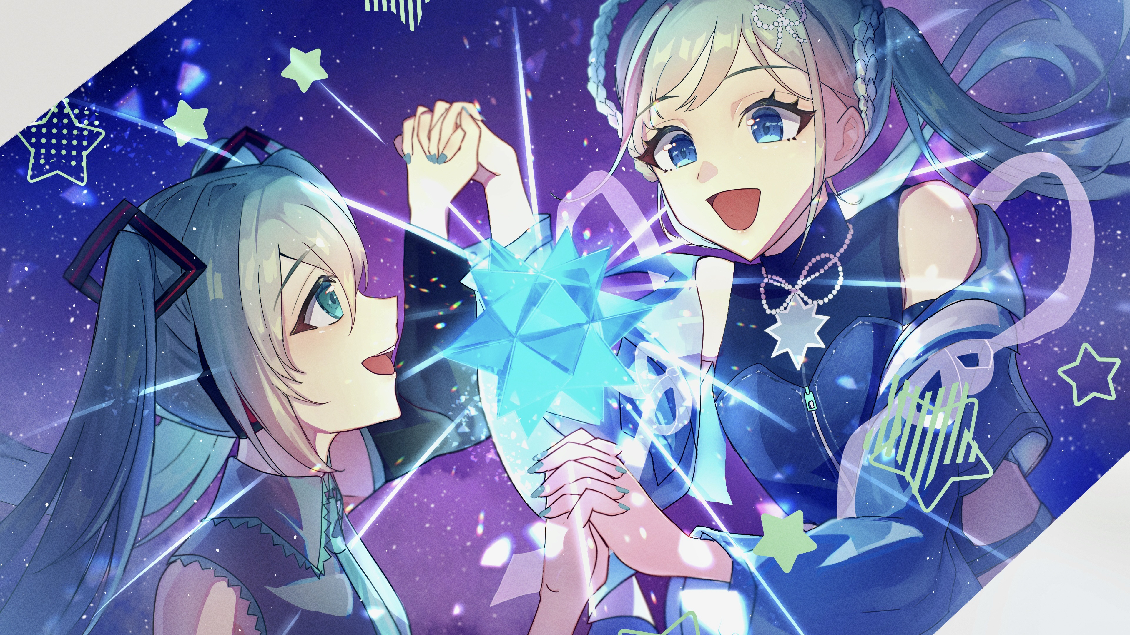 2girls absurdres aqua_eyes aqua_hair aqua_nails aqua_necktie blue_eyes blue_jacket braid braided_hair_rings collared_shirt crop_top detached_sleeves dual_persona grey_shirt hair_between_eyes hair_ornament hair_rings hatsune_miku highres holding_hands jacket long_hair long_sleeves looking_at_another lustrous_(vocaloid) magical_mirai_(vocaloid) magical_mirai_miku magical_mirai_miku_(2025) multiple_girls necktie official_alternate_costume official_alternate_hairstyle open_clothes open_jacket open_mouth s1n0_0103 shirt sleeveless sleeveless_shirt small_stellated_dodecahedron smile twintails very_long_hair vocaloid