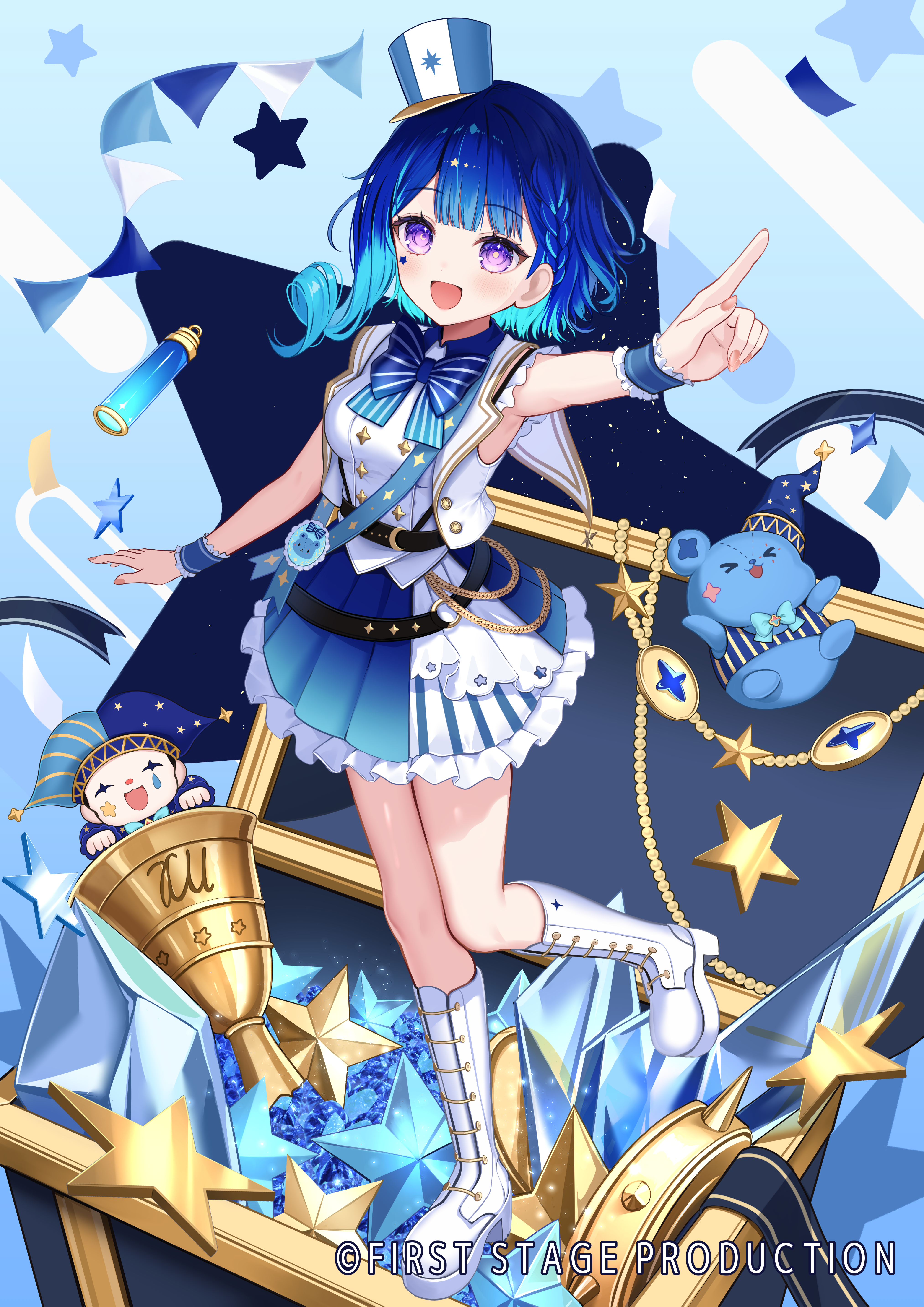 1girl :d absurdres bell blue_bow blue_hair blue_skirt boots bow braid commentary_request copyright_notice cropped_jacket drill_hair first_stage_production frilled_skirt frilled_wrist_cuffs frills fuyoyo hat highres hoshikage_tetra index_finger_raised jacket mark_under_eye medium_hair mini_hat official_art open_clothes open_jacket open_mouth pleated_skirt purple_eyes shirt single_sidelock skirt sleeveless sleeveless_jacket sleeveless_shirt smile solo star_(symbol) virtual_youtuber white_boots white_jacket white_shirt wrist_cuffs