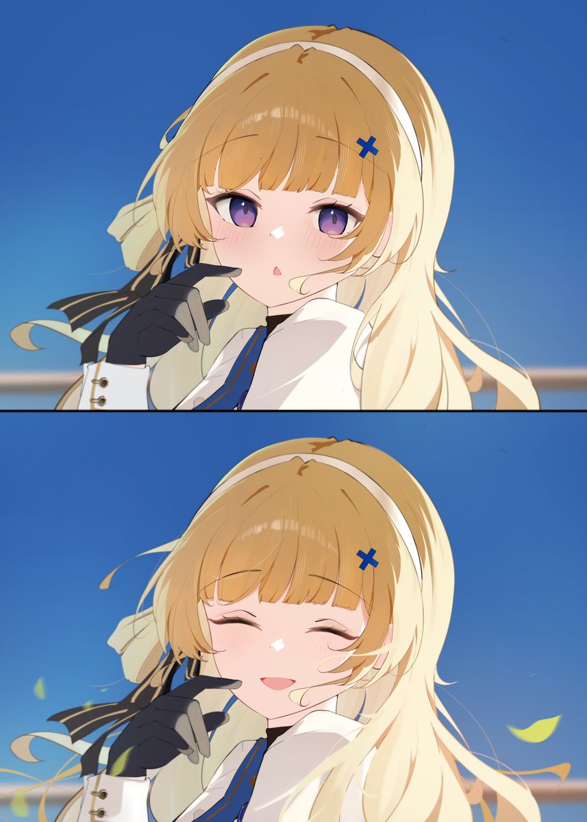 1girl black_gloves blonde_hair blue_sky blush closed_eyes commentary day from_side gloves hair_ornament hairband hand_up highres long_hair looking_at_viewer looking_to_the_side missing_headwear open_mouth outdoors parted_lips phoebe_(wuthering_waves) purple_eyes scio_12 shirt sky smile white_hairband white_shirt wind wuthering_waves x_hair_ornament