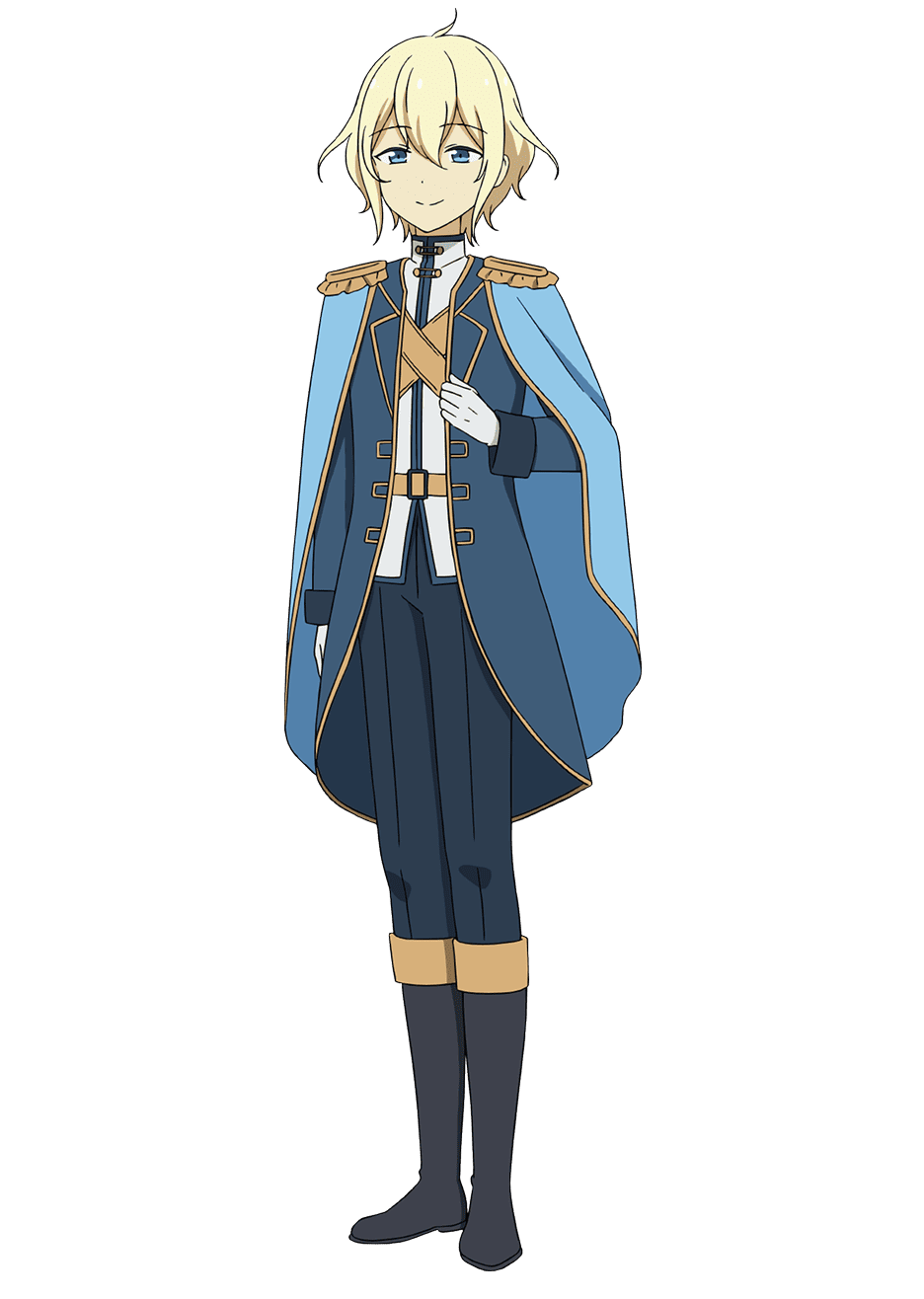 1boy ahoge anime_coloring belt blonde_hair blue_cloak blue_coat blue_eyes blue_pants boots brown_belt chichi_wa_eiyuu_haha_wa_seirei_musume_no_watashi_wa_tenseisha child cloak coat collared_jacket full_body gadiel_(chichi_wa_eiyuu) gloves grey_boots hair_between_eyes hand_up highres jacket long_sleeves looking_at_viewer official_art oosawa_mina pants short_hair simple_background smile solo standing transparent_background white_gloves white_jacket