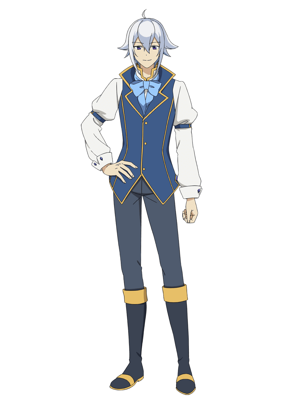 1boy ahoge anime_coloring arm_belt black_boots blue_bow blue_eyes blue_hair blue_vest boots bow bowtie chichi_wa_eiyuu_haha_wa_seirei_musume_no_watashi_wa_tenseisha closed_mouth collared_vest flipped_hair full_body grey_pants hair_between_eyes hand_on_own_hip highres long_sleeves looking_at_viewer official_art oosawa_mina pants puffy_long_sleeves puffy_sleeves rovel_(chichi_wa_eiyuu) shirt sidelocks simple_background smile solo standing tachi-e transparent_background vest white_shirt