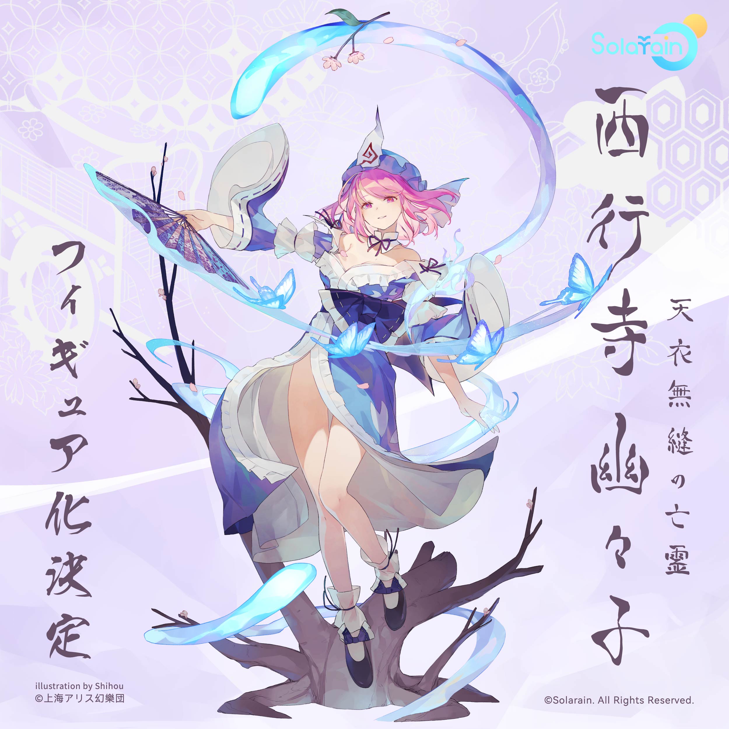 1girl absurdres blue_hat blue_kimono breasts bug butterfly character_name cleavage frilled_kimono frills full_body ghost hand_fan hat highres holding holding_fan insect japanese_clothes kimono official_art pink_eyes pink_hair saigyouji_yuyuko second-party_source shihou_(g-o-s) short_hair smile solo touhou triangular_headpiece wide_sleeves