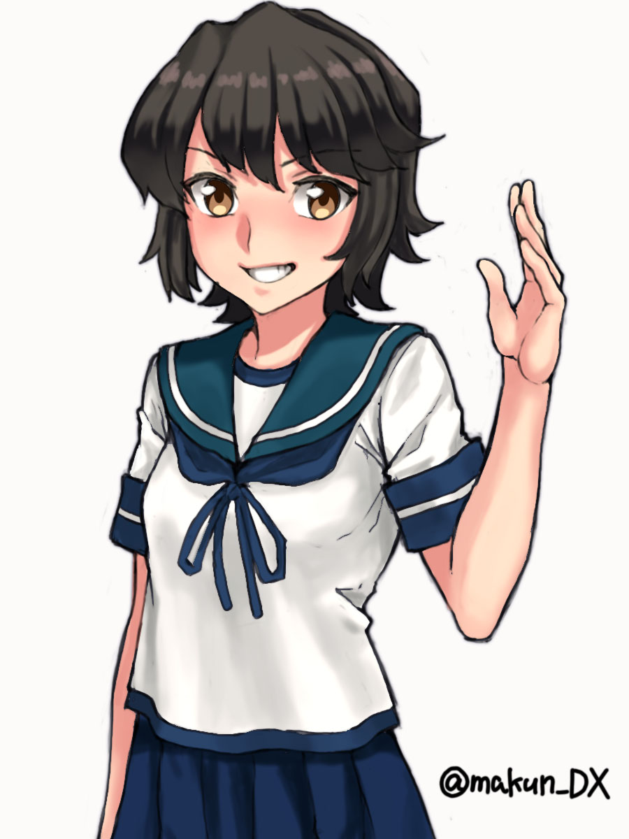 1girl black_hair blue_neckerchief blue_sailor_collar blue_skirt brown_eyes grin highres kantai_collection maakun_(makun_dx) miyuki_(kancolle) neckerchief one-hour_drawing_challenge sailor_collar sailor_shirt school_uniform serafuku shirt short_hair short_sleeves simple_background skirt smile solo twitter_username waving white_background white_shirt