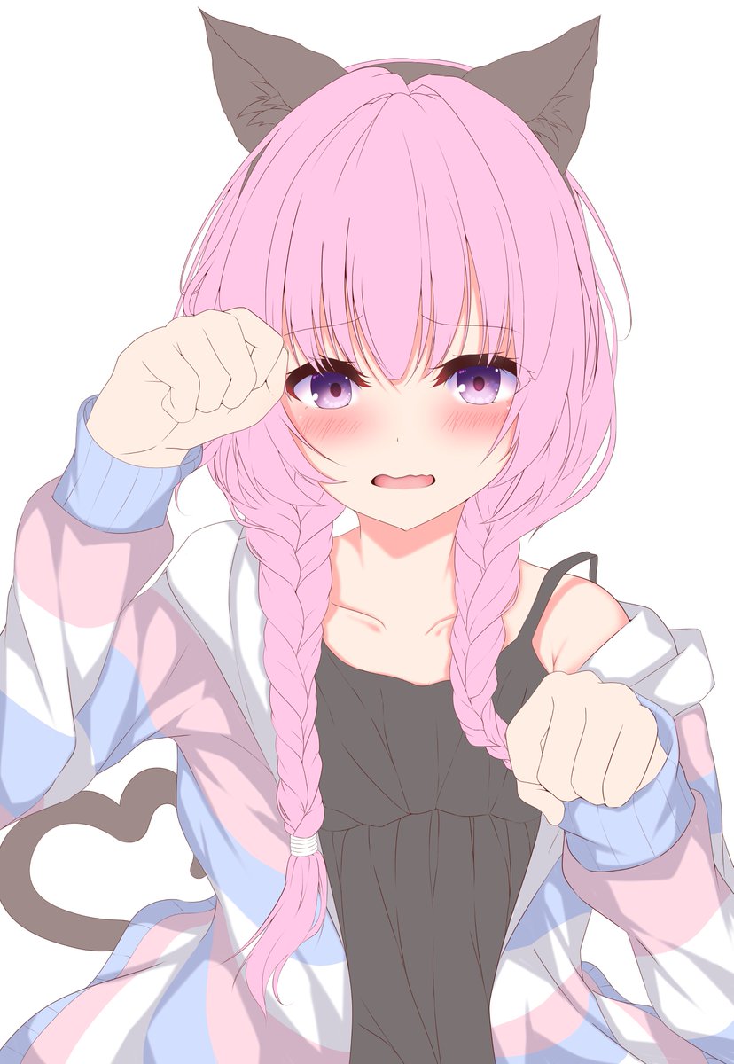 1girl animal_ear_fluff animal_ear_hairband animal_ears black_camisole black_hairband blush braid camisole cat_ears cat_tail collarbone commentary_request embarrassed eyelashes eyes_visible_through_hair fake_animal_ears fake_tail hair_between_eyes hair_intakes hairband heart heart_tail highres hood hood_up jacket koyo_aki_(vtvd5277) long_hair looking_at_viewer low_twintails mitsukasa_ayase official_alternate_costume official_alternate_hairstyle open_clothes open_jacket open_mouth paw_pose pink_hair purple_eyes riddle_joker simple_background sleeves_past_wrists solo striped_clothes striped_jacket tail twin_braids twintails upper_body wavy_mouth white_background