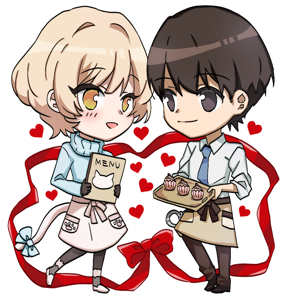 1boy 1girl apron blonde_hair blue_necktie blush brown_eyes brown_hair cat_tail chibi cupcake food heart holding holding_menu kisaki_asuna menu moritsuka_shun necktie no_coat no_jacket occultic;nine open_mouth pantyhose science_adventure shirt short_hair smile tail transparent_background yuka_4092