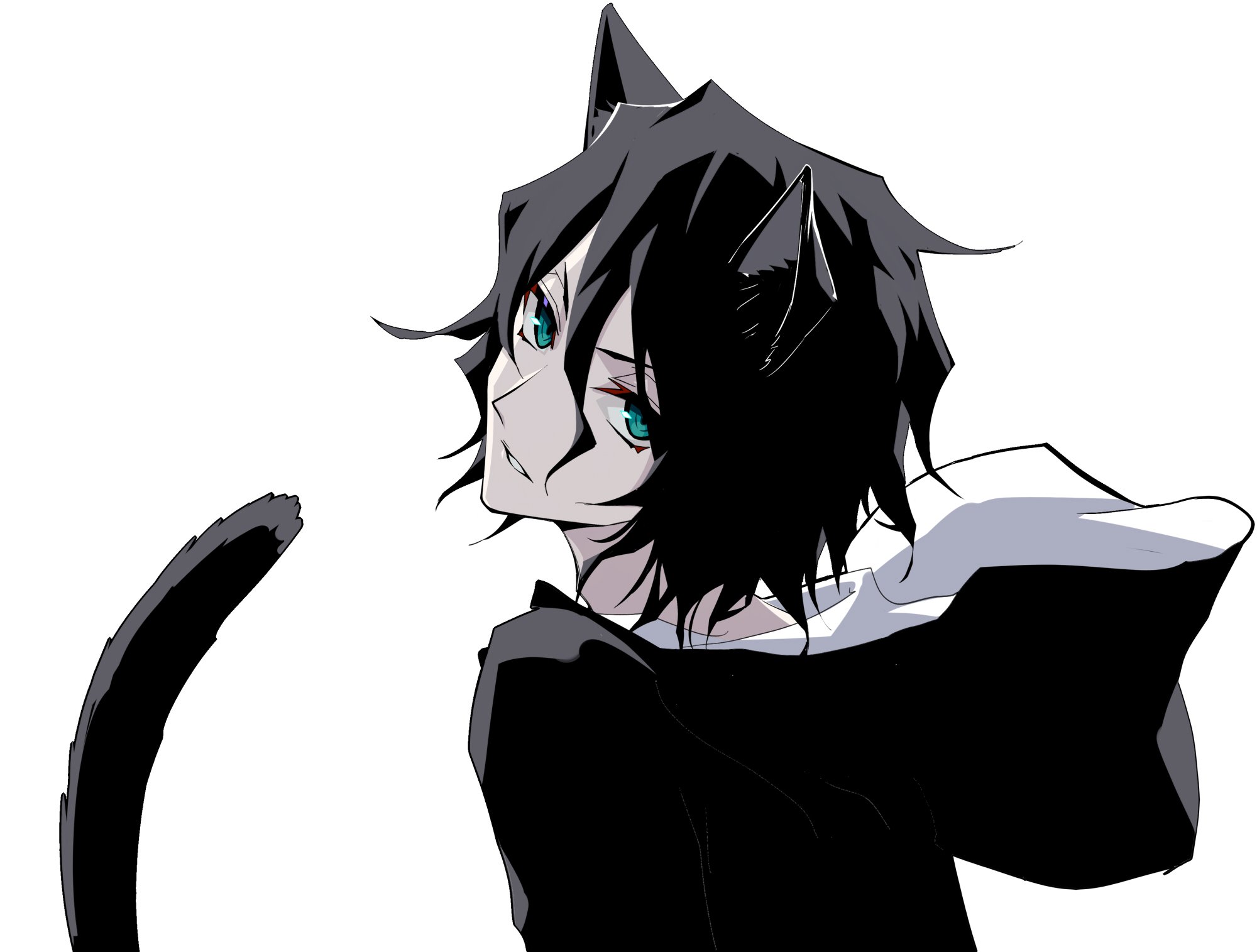 1boy animal_ears black_hair bleach cat_boy cat_ears cat_tail hair_between_eyes highres hood hoodie kemonomimi_mode long_hair looking_at_viewer male_focus short_hair simple_background solo tail tensa_zangetsu tensa_zangetsu_(bankai) white_background zangetsu_(bleach) zangjun zanpakutou_(spirit)