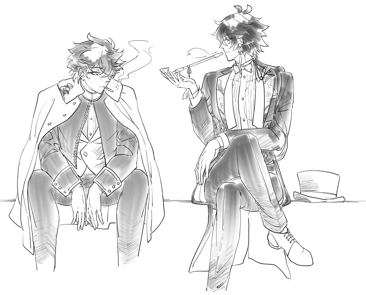 2boys alternate_costume crossed_legs ergogida formal_clothes genshin_impact greyscale hat monochrome multiple_boys smoking smoking_pipe tartaglia_(genshin_impact) top_hat twitter white_background zhongli_(genshin_impact)