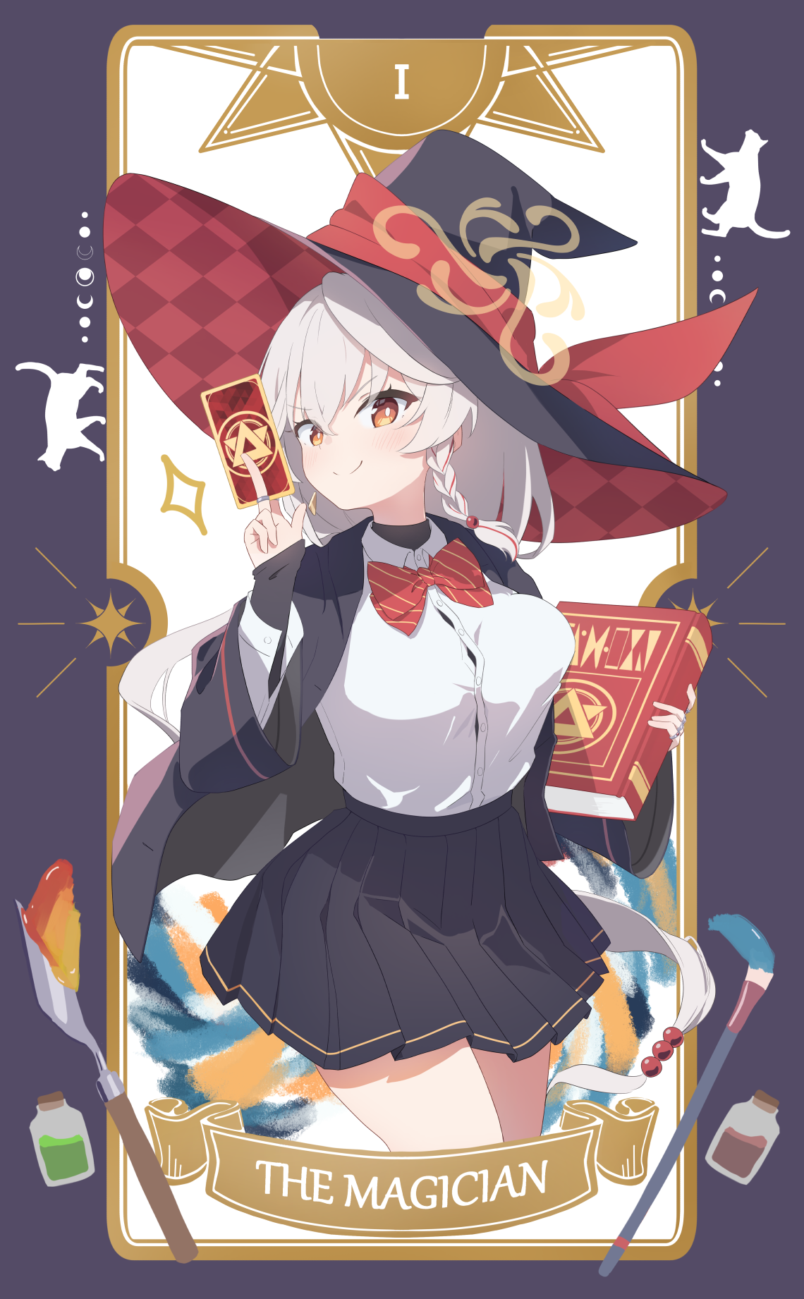 >:) 1girl black_border black_hat black_jacket black_skirt blue_archive blush book border bow bowtie braid breasts bright_pupils card closed_mouth collared_shirt commentary_request cowboy_shot diagonal-striped_bow diagonal-striped_bowtie diagonal-striped_clothes dress_shirt dual_wielding english_text eri_(blue_archive) gaaratelier grey_hair hair_between_eyes hair_bobbles hair_ornament halo hand_up hat highres holding holding_book holding_card jacket jewelry large_breasts long_hair long_sleeves looking_at_viewer low_ponytail miniskirt multiple_rings orange_eyes outside_border pleated_skirt ponytail red_bow red_bowtie ring school_uniform shirt simple_background single_braid skirt sleeves_past_wrists smile smug solo split_mouth striped_bow striped_bowtie striped_clothes tarot tarot_card turtleneck v-shaped_eyebrows very_long_hair white_background white_pupils white_shirt wide_sleeves witch witch_hat yellow_halo