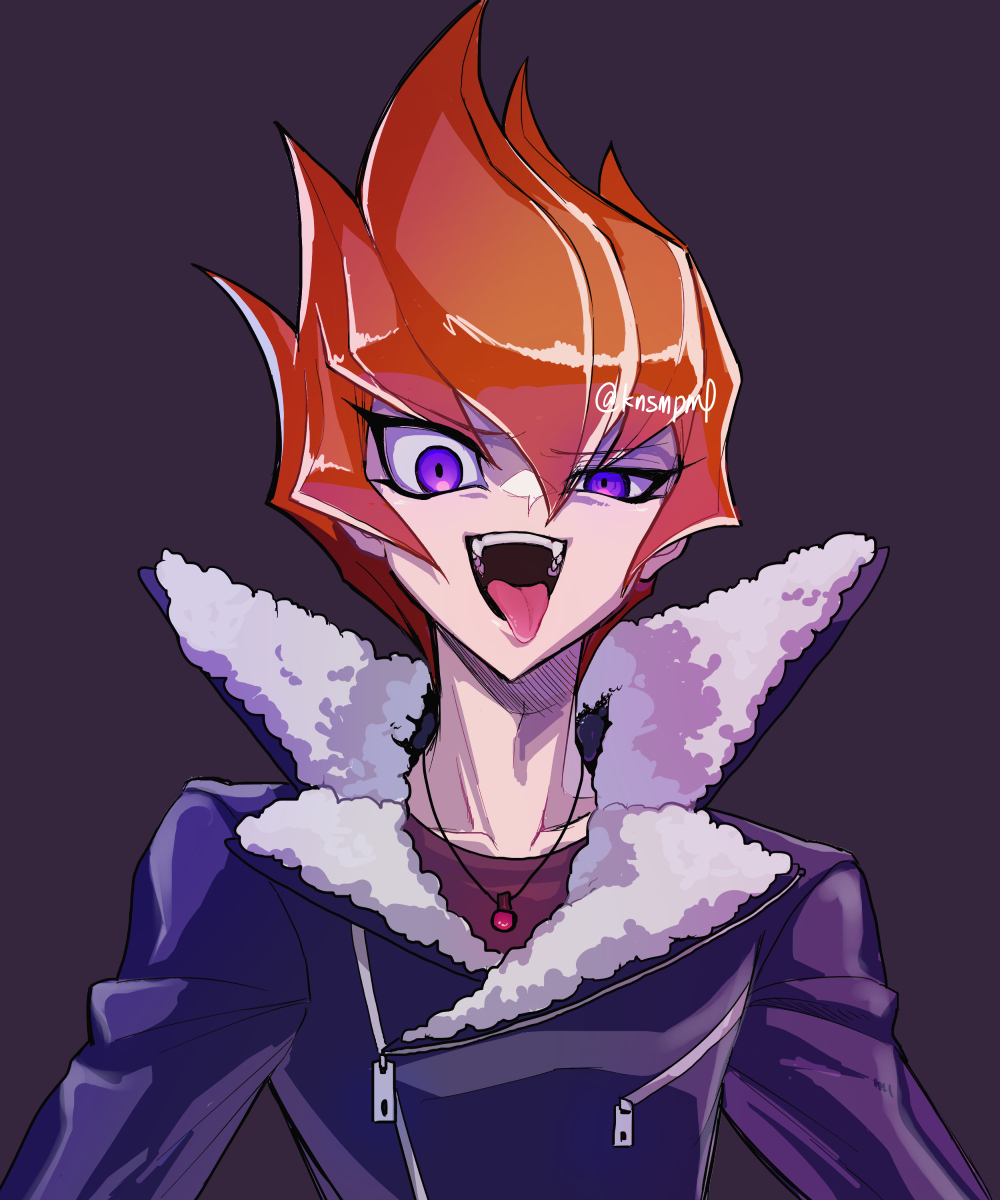 1boy black_jacket grey_background half-closed_eye highres jacket jewelry male_focus medium_hair open_mouth orange_hair pendant purple_eyes shi_shoku simple_background solo spiked_hair teeth tongue tongue_out upper_teeth_only vector_(yu-gi-oh!) yu-gi-oh! yu-gi-oh!_zexal
