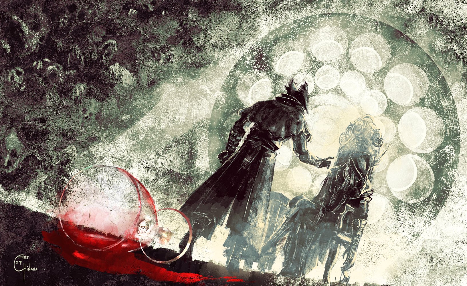 1girl 1other artofchinara ascot blood bloodborne boots bracer capelet chair coat crossed_legs cup full_body gloves greyscale hat hat_feather highres holding holding_weapon hunter_(bloodborne) lady_maria_of_the_astral_clocktower long_coat long_hair monochrome pants sitting spot_color standing tricorne weapon