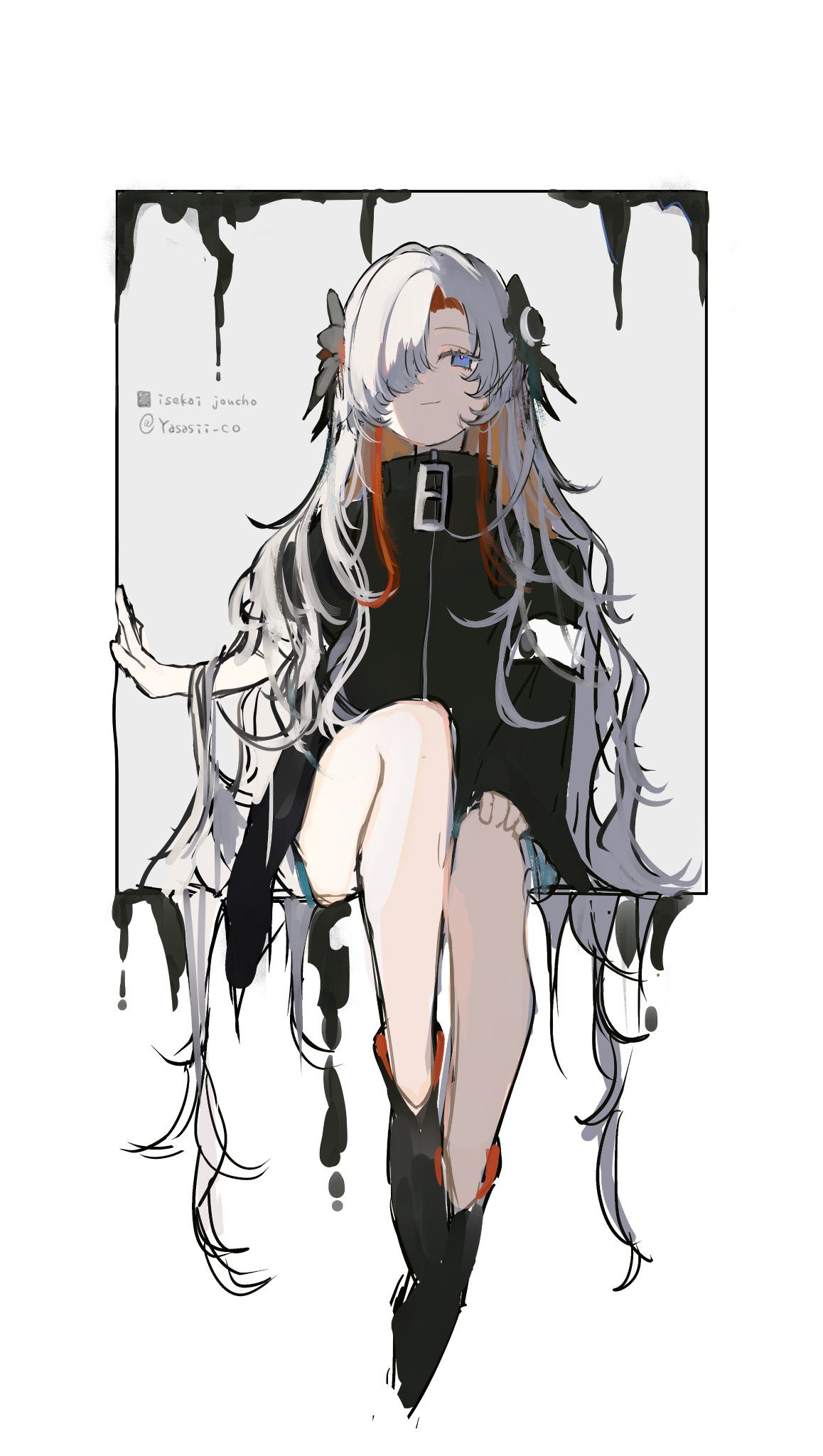 1girl asymmetrical_sleeves black_coat black_flower blue_eyes boots closed_mouth coat dripping expressionless flower full_body gloves grey_hair hair_flower hair_ornament hair_over_one_eye high_collar highres invisible_chair isekaijoucho kamitsubaki_studio long_hair long_sleeves looking_at_viewer multicolored_hair red_hair simple_background single_glove sitting sketch solo streaked_hair toke_ino twitter_username two-tone_hair uneven_sleeves very_long_hair virtual_youtuber white_background white_hair zipper_pull_tab