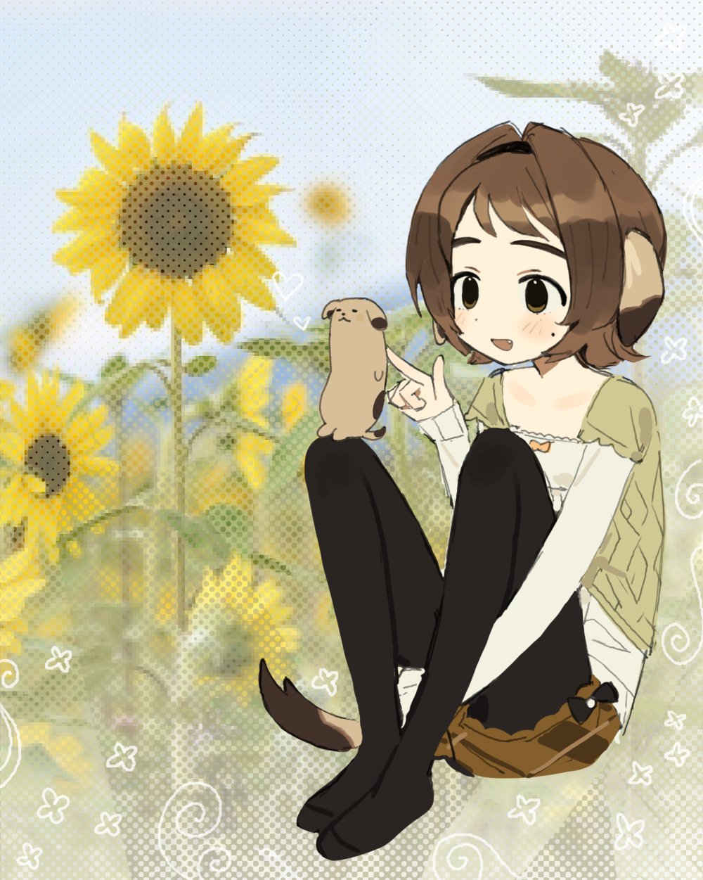 1girl animal animal_ears black_eyes black_pantyhose blush brown_hair brown_shorts dog_ears dog_tail flower full_body hair_intakes highres indie_virtual_youtuber long_sleeves looking_at_animal mole mole_under_eye mota_(motaberrie) motaberrie_(vtuber) no_shoes open_mouth outdoors pantyhose pantyhose_under_shorts shirt short_hair shorts sitting smile solo sunflower tail white_shirt yellow_flower