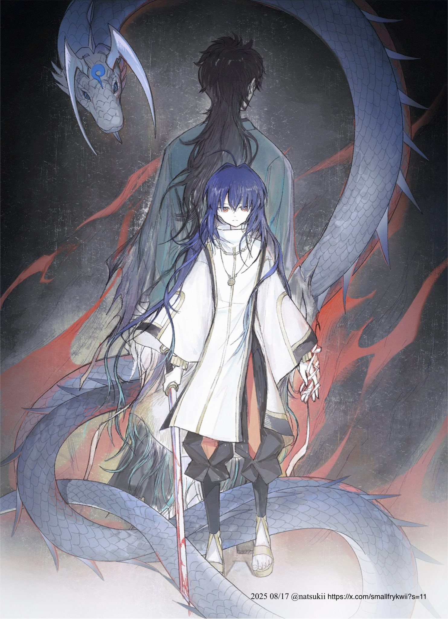 1boy 1other ahoge androgynous back-to-back bandages black_hair black_hakama blood blood_on_hands blue_hair blue_kimono dragon eastern_dragon fate/grand_order fate/samurai_remnant fate_(series) full_body hair_down hakama highres japanese_clothes kimono long_hair miyamoto_iori_(fate) natsukiki orange_eyes standing sword weapon yamato_takeru_(fate)