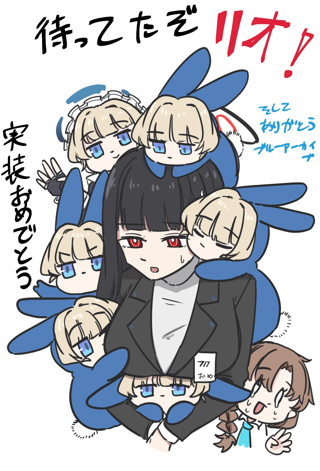 animal_costume animal_ears blonde_hair blue_archive blue_eyes braid brown_hair chibi female_sensei_(blue_archive) female_sensei_(blue_archive)_(mikazukimo_478) halo highres ichika_(blue_archive) jacket long_hair long_sleeves maid_headdress mikazukimo_478 multiple_girls necktie red_eyes sensei_(blue_archive) single_braid toki_(blue_archive) translation_request white_background