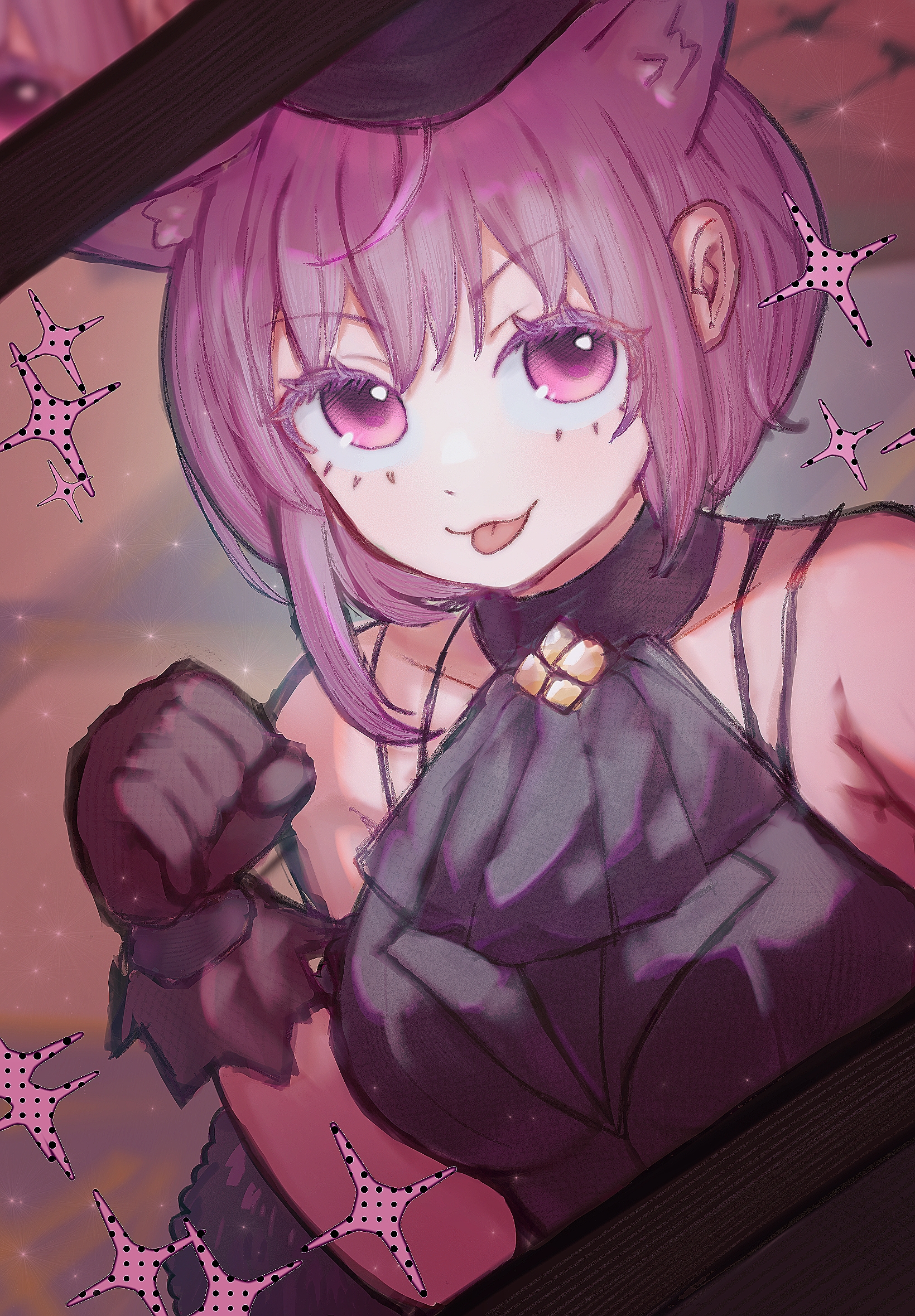 1girl :3 :p animal_ear_fluff animal_ears arknights ascot bang_dream! bang_dream!_it's_mygo!!!!! bare_shoulders black_ascot black_dress black_gloves black_hat breasts cat_ears cat_girl closed_mouth commentary_request dress gloves hand_up hat highres kemonomimi_mode large_breasts looking_at_viewer nanaura_komi paw_pose purple_eyes purple_hair short_hair smile solo sparkle tongue tongue_out upper_body yuutenji_nyamu yuutenji_nyamu_(magician_of_passion)