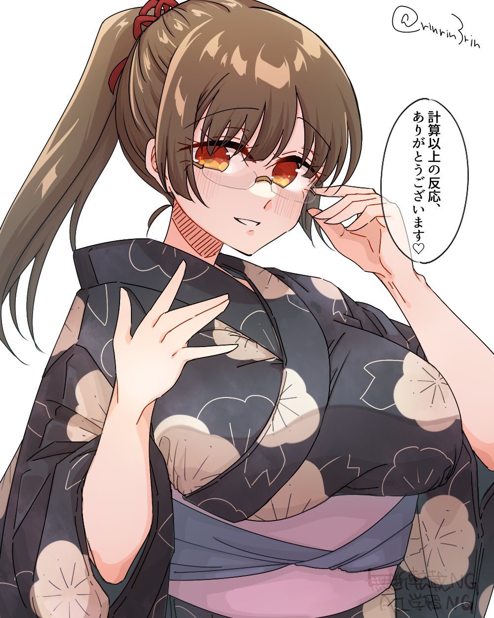 1girl alternate_costume alternate_hairstyle black_hair blue_kimono blush breasts choukai_(kancolle) glasses highres japanese_clothes kantai_collection kimono large_breasts long_hair long_sleeves looking_at_viewer matsunaga_(haku) obi ponytail red_eyes rimless_eyewear sash smile solo upper_body wide_sleeves