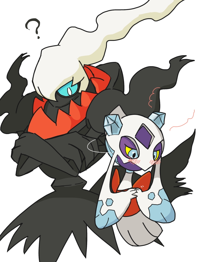 ? blue_eyes blush colored_sclera crossed_arms darkrai froslass gen_4_pokemon legendary_pokemon monya mythical_pokemon nintendo no_humans pokemon pokemon_(creature) simple_background white_background yellow_sclera