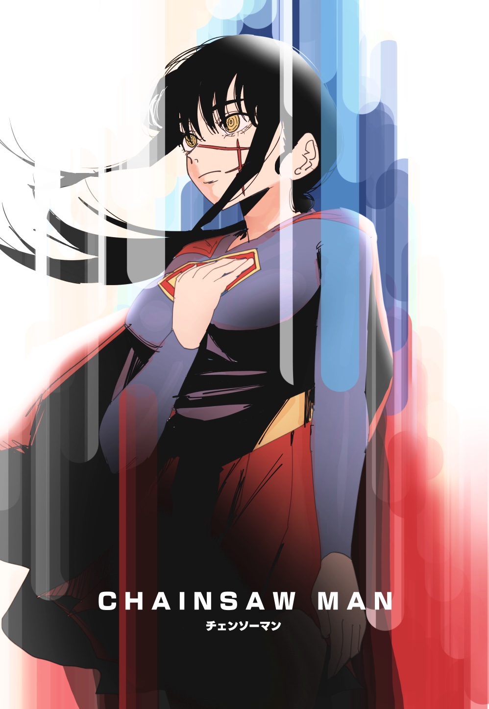 1girl black_hair blue_bodysuit bodysuit cape chainsaw_man closed_mouth cosplay dc_comics facial_scar hand_on_own_chest hashtag-only_commentary highres long_hair poster_parody red_cape ringed_eyes scar scar_on_cheek scar_on_face scar_on_nose solo superhero_costume superman superman_(cosplay) superman_(series) y7u7e7 yellow_eyes yoru_(chainsaw_man)