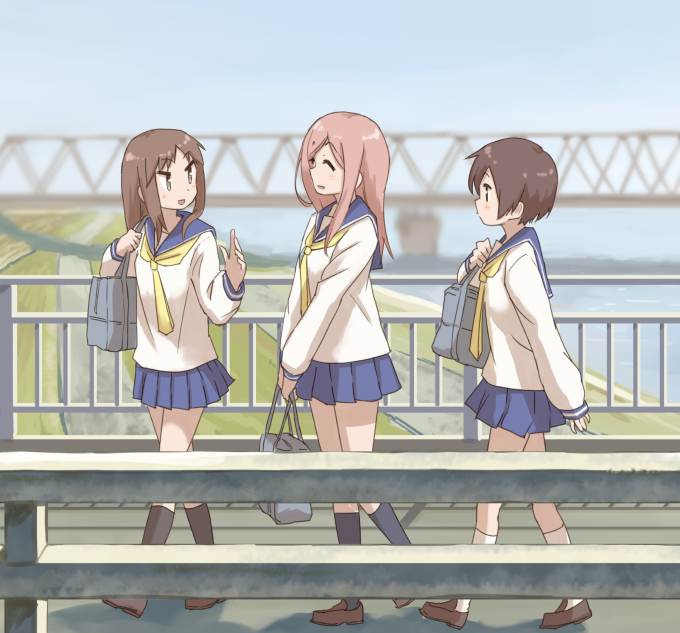 3girls ^_^ aikawa_chiho bag black_socks blue_skirt blush bridge brown_eyes brown_hair closed_eyes cropped day hasegawa_fumi kneehighs long_hair looking_at_another multiple_girls necktie okano_kei open_mouth outdoors school_bag school_uniform serafuku short_hair skirt slice_of_life smile socks umiroku white_socks yellow_necktie yuyushiki yuyushiki's_school_uniform