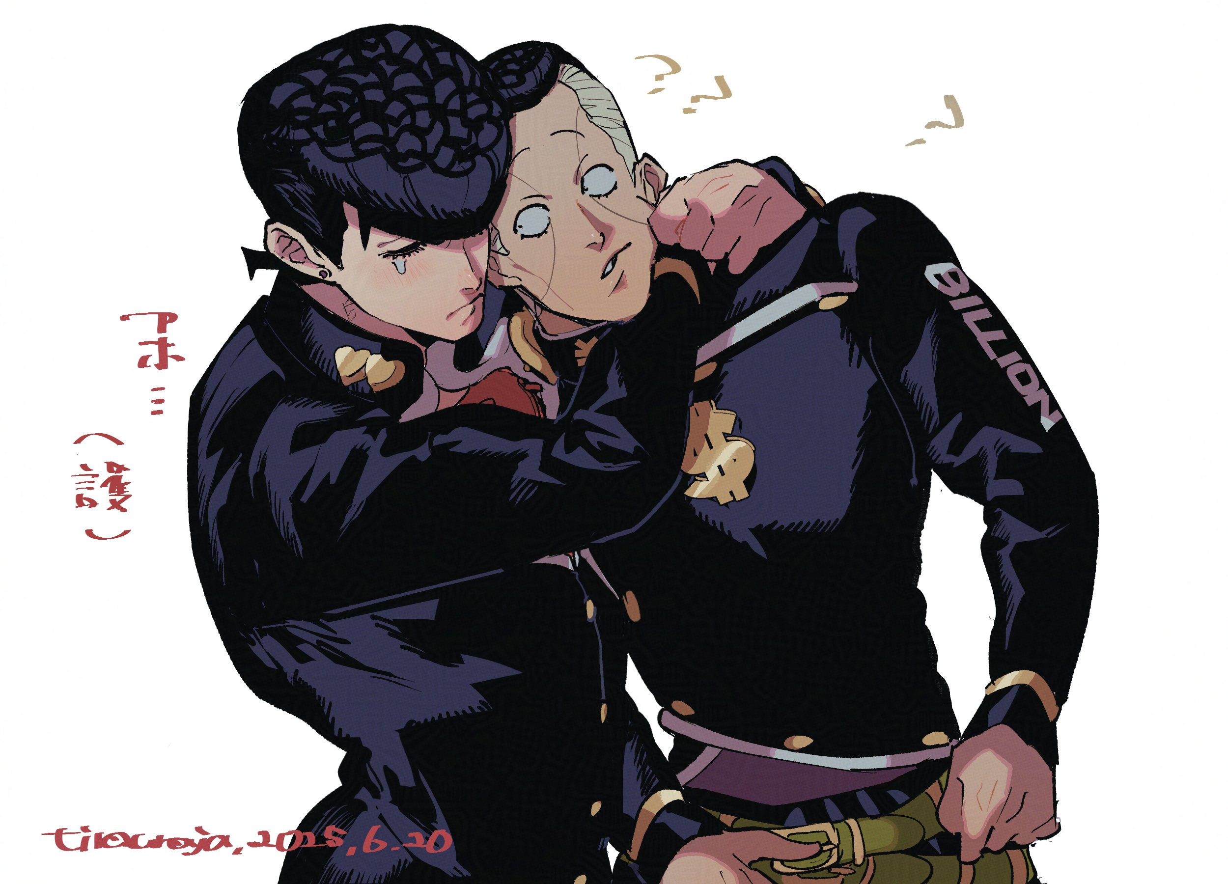 2boys ? arms_around_neck artist_name belt belt_buckle black_hair black_jacket brooch buckle buttons commentary_request cowboy_shot crying dated diamond_wa_kudakenai dollar_sign earrings english_text facial_mark gakuran green_belt grey_hair heart higashikata_josuke highres hug jacket jewelry jojo_no_kimyou_na_bouken long_sleeves looking_at_another looking_to_the_side male_focus multicolored_hair multiple_belts multiple_boys nijimura_okuyasu parted_lips piercing pompadour school_uniform short_sideburns sideburns simple_background stud_earrings tears teeth tirauraja translation_request two-tone_hair white_background yen_sign