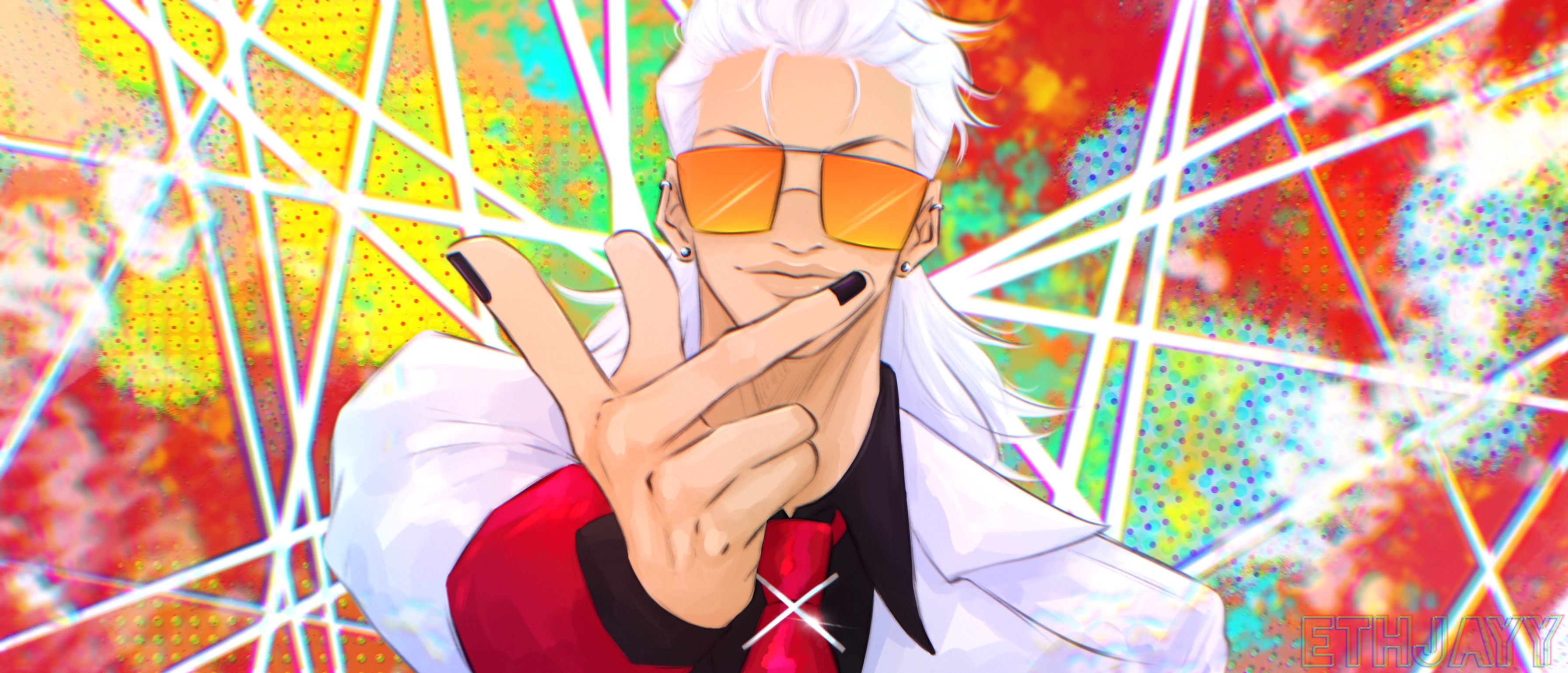 1boy absurdres artist_name black_nails ear_piercing ethjayy facing_viewer glasses hair_slicked_back hand_up highres long_hair male_focus necktie orange-tinted_eyewear piercing red_necktie shirt smile snapping_fingers tinted_eyewear to_be_hero_x upper_body white_hair white_shirt x_(to_be_hero_x)