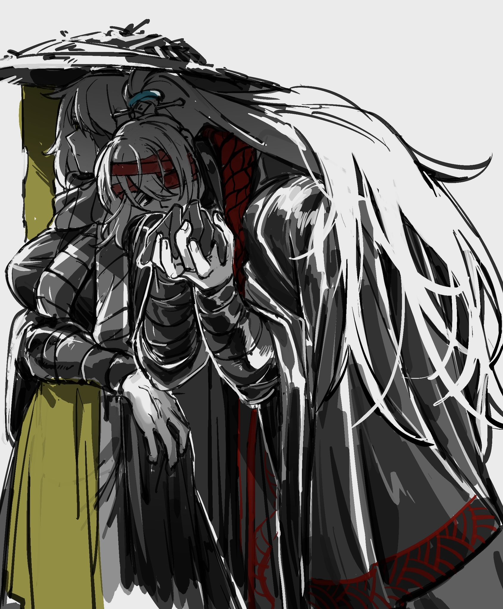 1girl bandage_over_one_eye bandaged_arm bandages black_eyes black_hair black_hanfu breasts chinese_clothes closed_mouth conical_hat hongyuan_(identity)_(project_moon) faust_(project_moon) grey_scarf hand_wraps hanfu heishou_pack-mao_branch_(identity)_(project_moon) high_ponytail highres holding_hands hong_lu_(project_moon) keisotu_kuruu limbus_company long_hair looking_at_viewer one_eye_covered partially_colored ponytail project_moon red_ribbon ribbon scarf simple_background standing upper_body white_background white_hair yellow_ribbon