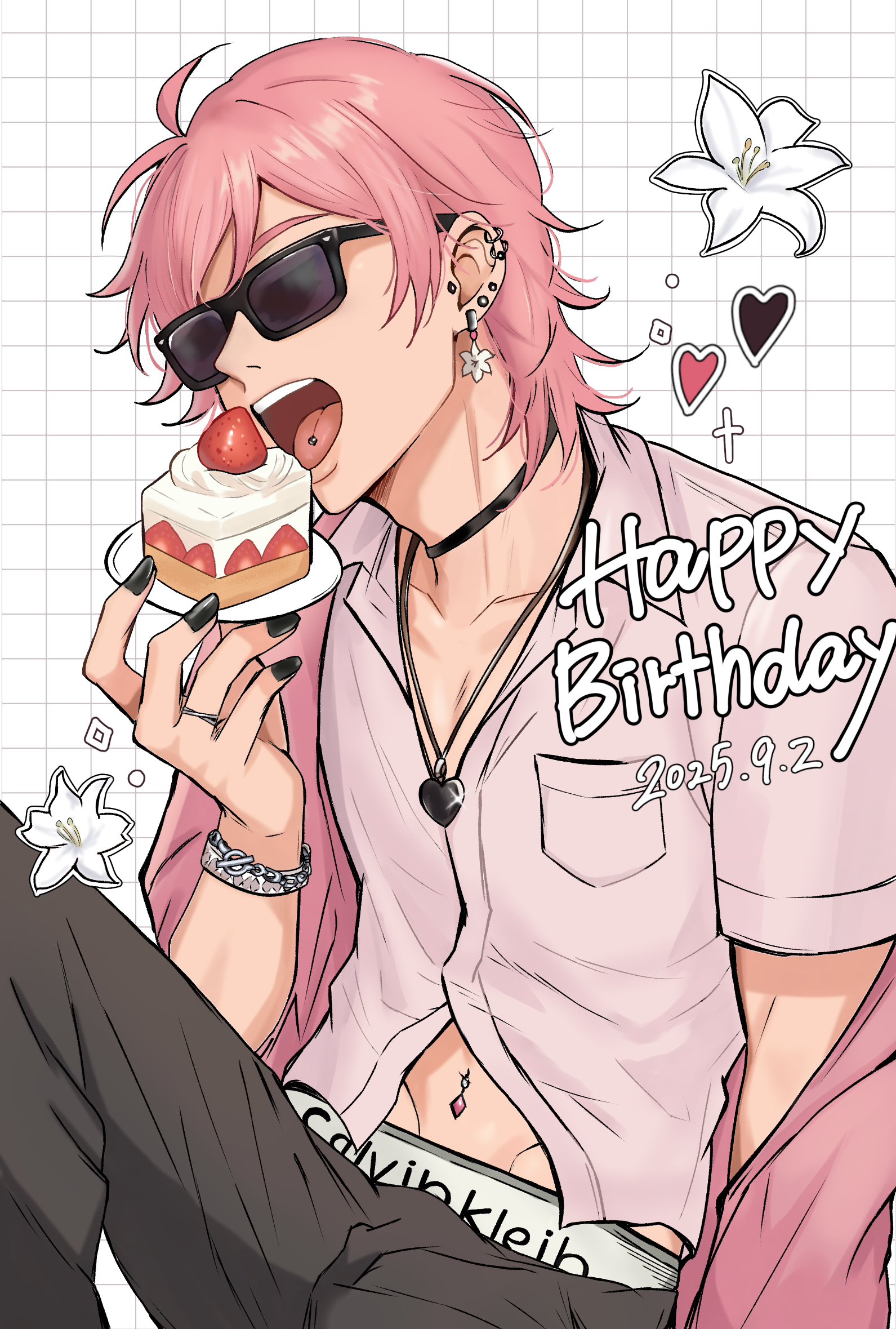 1boy black-framed_eyewear black_choker black_nails black_pants bracelet cake cake_slice choker collarbone commentary_request dated ear_piercing earrings flower_earrings food glasses grid_background happy_birthday heart heart_necklace highres holding holding_cake holding_food jewelry looking_at_viewer male_focus male_underwear male_underwear_peek navel_piercing necklace open_mouth pants piercing pink_hair pink_shirt pocket ring shirt short_hair sitting solo sunglasses teeth tongue tongue_piercing underwear upper_teeth_only yarichin_bitch-bu yuri_ayato yuriri_92