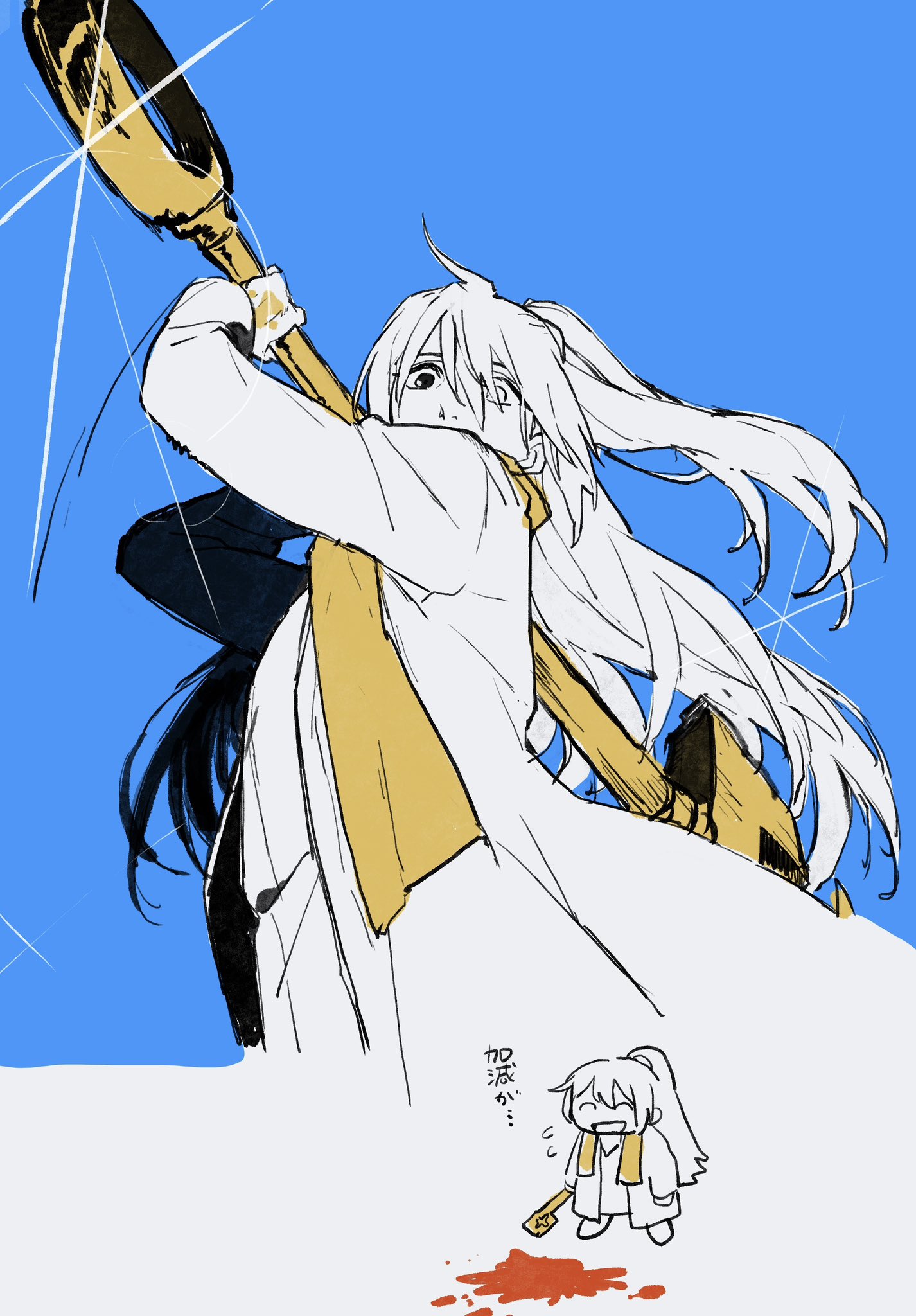 1boy black_hair blood blue_background chibi chibi_inset coat dieci_association_south_uniform heterochromia high_ponytail highres holding holding_key hong_lu_(project_moon) keisotu_kuruu key limbus_company long_hair looking_at_viewer male_focus partially_colored ponytail project_moon simple_background solo stole upper_body yellow_stole
