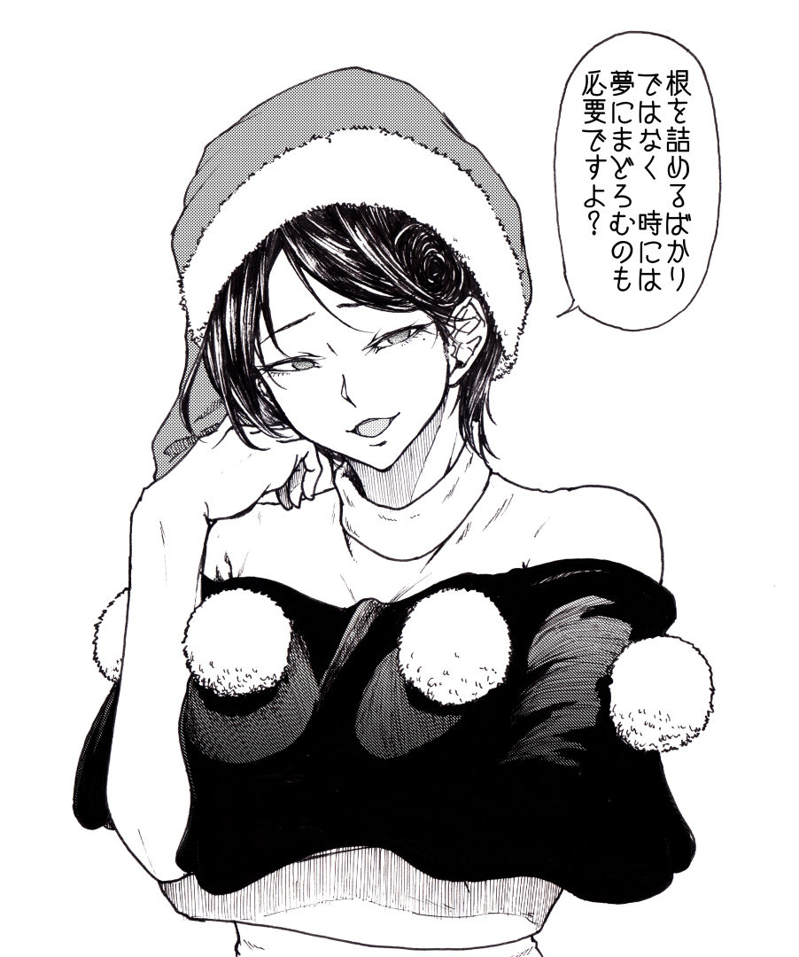 1girl capelet doremy_sweet greyscale hat head_rest koyubi_(littlefinger1988) looking_to_the_side monochrome nightcap pom_pom_(clothes) shirt short_hair solo touhou turtleneck turtleneck_shirt upper_body