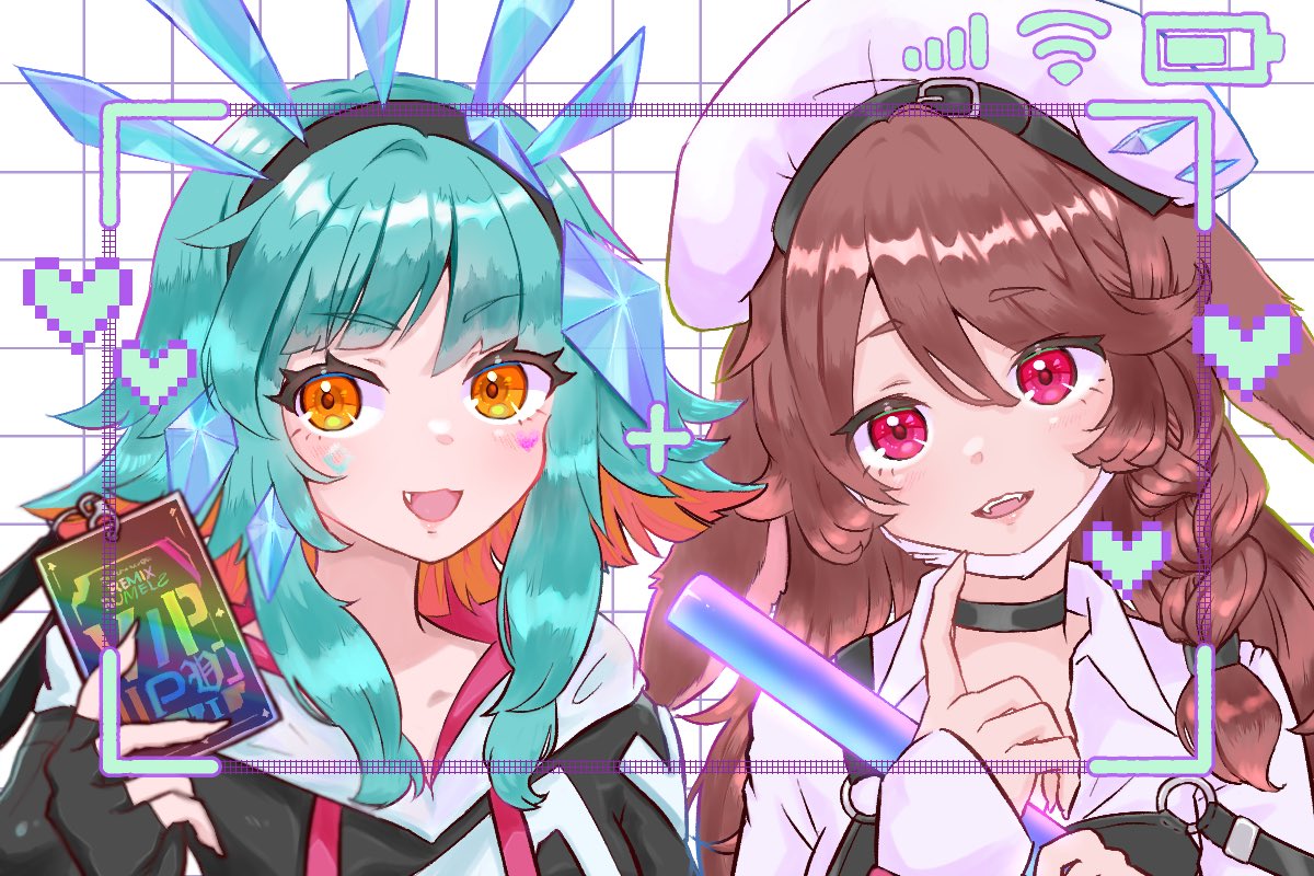 2girls animal_ears aqua_hair battery_indicator beret black_choker black_gloves black_hairband black_hoodie black_overalls braid brown_hair choker colored_inner_hair commentary_request crosshair crystal_hair_ornament double-parted_bangs fang fangs finger_to_mouth fingerless_gloves gloves glowstick grid_background hairband hat heart heart_sticker holding holding_glowstick holding_lanyard hood hoodie k/da_(league_of_legends) k/da_lillia k/da_neeko lanyard league_of_legends lillia_(league_of_legends) long_hair mask medium_hair mouth_mask multicolored_hair multiple_girls neeko_(league_of_legends) open_mouth orange_eyes overalls pixel_heart portrait shirt side_braid sidelocks single_braid sio_proof smile sticker sticker_on_face swept_bangs teamfight_tactics unworn_lanyard unworn_mask viewfinder white_background white_hat white_shirt wi-fi_symbol