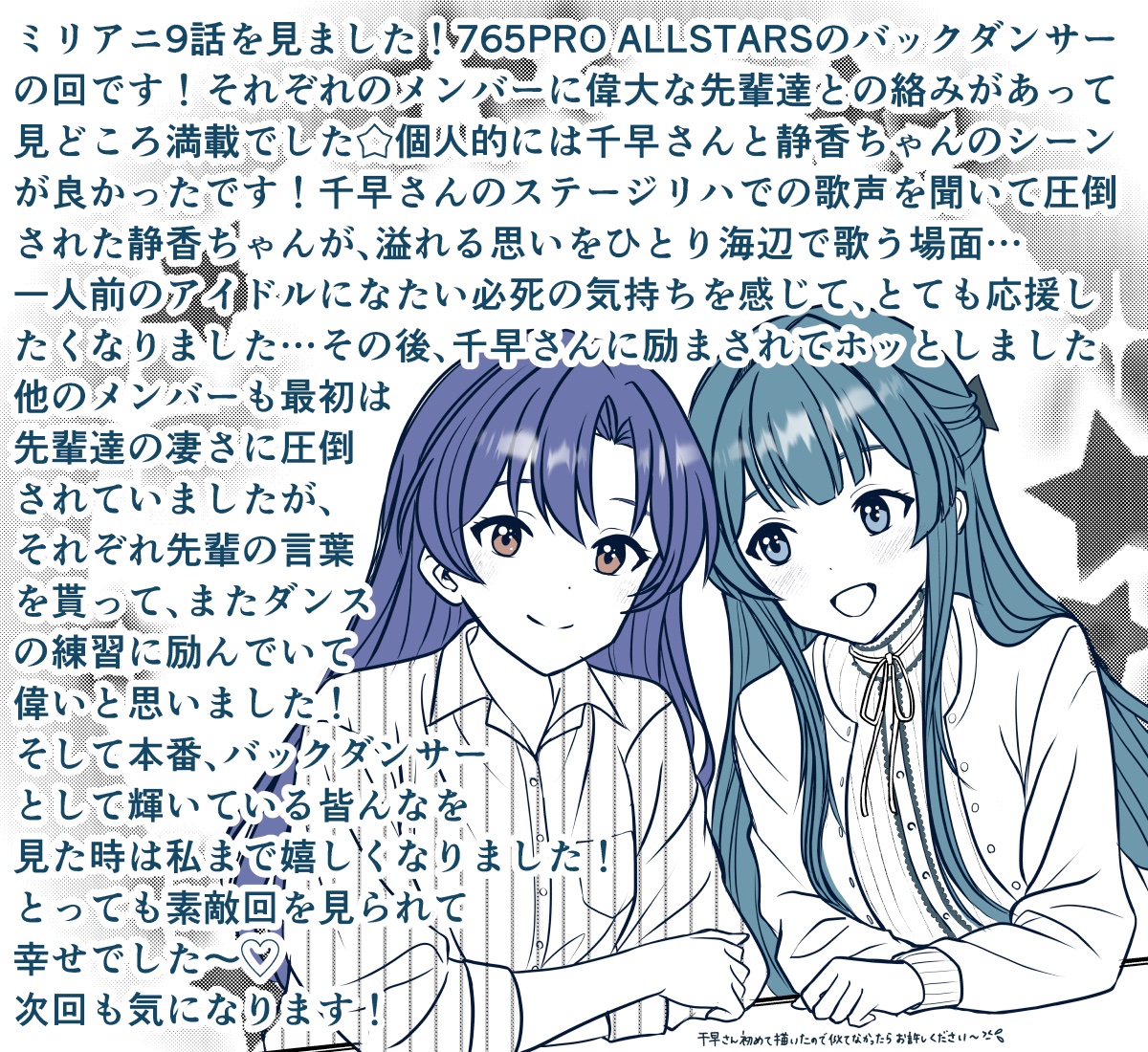 2girls :d arm_rest blue_eyes blue_hair brown_eyes closed_mouth collared_shirt commentary_request idolmaster idolmaster_(classic) idolmaster_million_live! idolmaster_million_live!_(anime) kisaragi_chihaya long_hair long_sleeves looking_at_another looking_at_viewer mogami_shizuka multiple_girls open_mouth partially_colored shirt side-by-side smile text_focus translation_request upper_body yuzuki_nagikaze