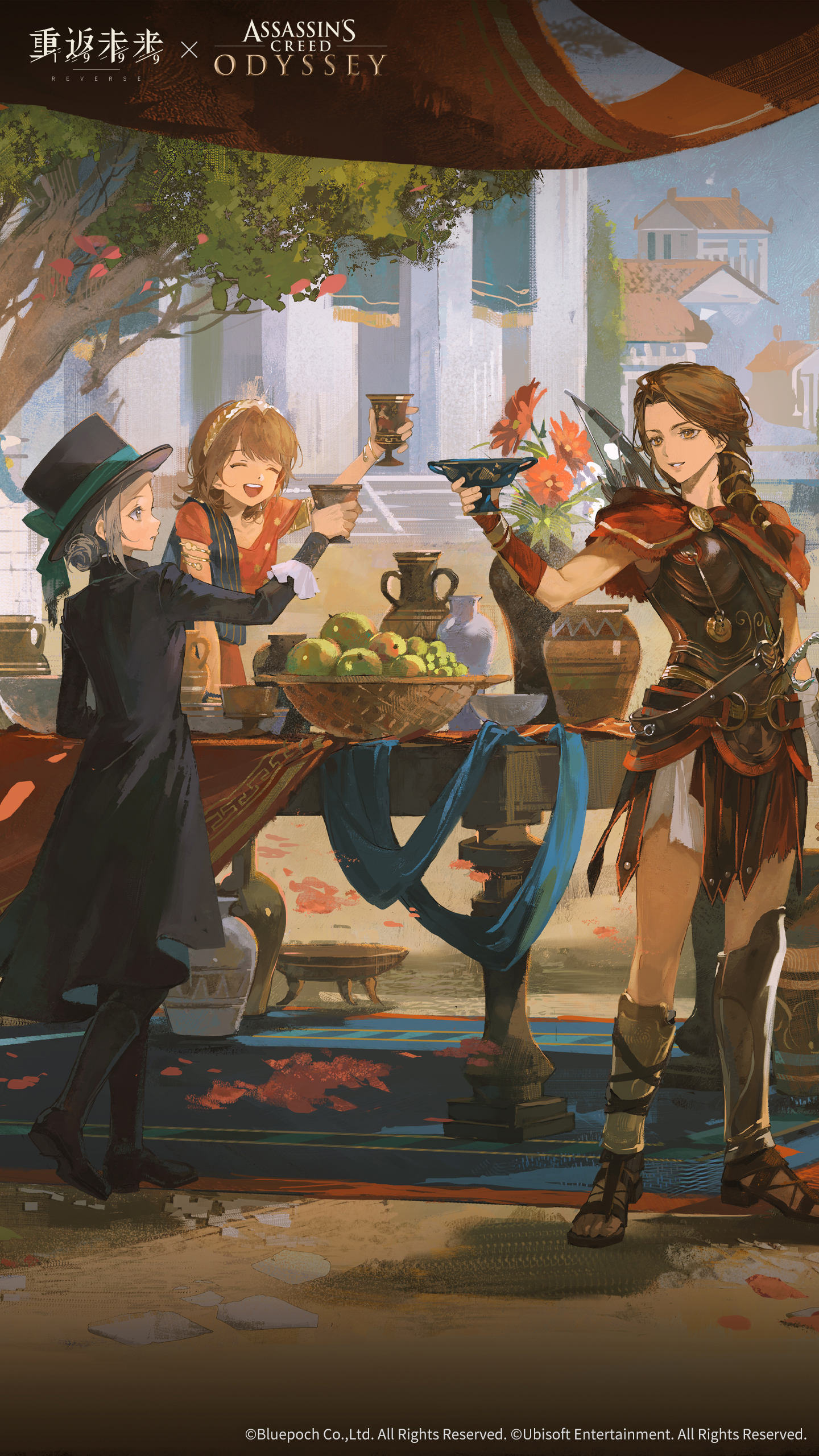 3girls absurdres ancient_greek_clothes apple apple_(reverse:1999) apple_(the_fruit_of_wisdom)_(reverse:1999) apple_of_eden_(assassin's_creed) assassin's_creed:_odyssey assassin's_creed_(series) basket bow_(weapon) cityscape copyright_name copyright_notice crossover cup food fruit golden_apple greco-roman_clothes greek_armor highres holding holding_cup holding_harp kassandra_of_sparta logo multiple_boys multiple_girls official_alternate_costume official_art official_wallpaper regulus_(reverse:1999) reverse:1999 table toasting_(gesture) vase vertin_(reverse:1999) weapon