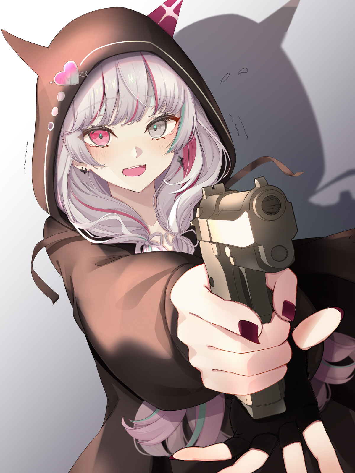 1girl aiming animal_hood blush earrings flying_sweatdrops grey_eyes grey_hair gun handgun heart heterochromia highres holding holding_gun holding_weapon hood hood_up hooded_jacket hoodie ishigami_nozomi ishigami_nozomi_(2nd_costume) jacket jewelry long_hair long_sleeves looking_at_viewer multicolored_hair nail_polish nijisanji open_mouth pink_eyes pink_hair purple_nails shadow solo streaked_hair trembling upper_body virtual_youtuber weapon yu-ki_(user_dttw2327)