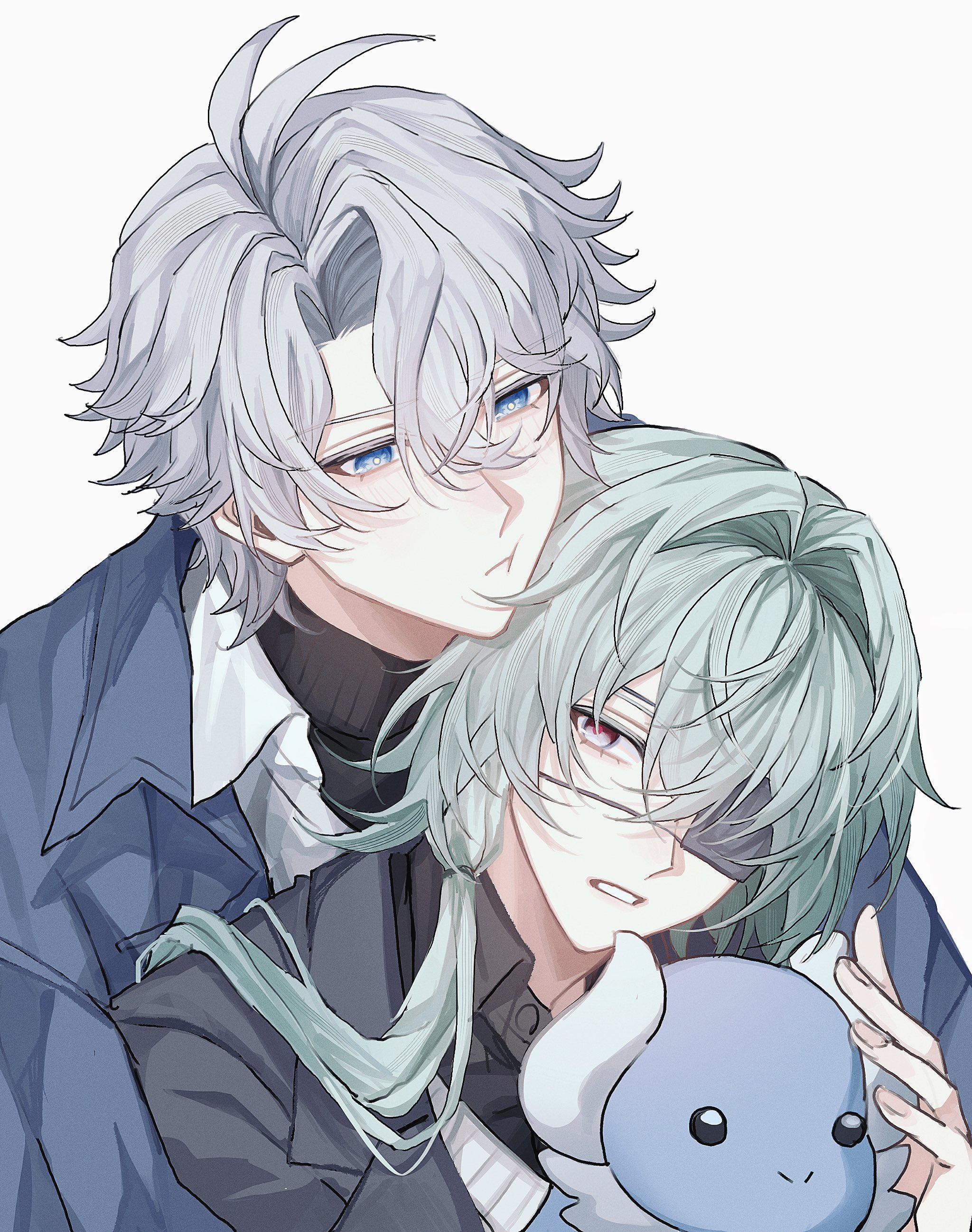 2boys absurdres anaxa_(honkai:_star_rail) antenna_hair aqua_hair black_jacket black_sweater blue_coat blue_eyes coat crossed_bangs eyepatch fz7047 grey_hair hair_between_eyes hair_intakes highres honkai:_star_rail honkai_(series) jacket male_focus multicolored_eyes multiple_boys official_alternate_costume open_clothes open_coat open_shirt parted_bangs phainon_(honkai:_star_rail) phainon_(luckin_coffee)_(honkai:_star_rail) pink_eyes pout shirt short_hair side_ponytail simple_background solo sweater turtleneck turtleneck_sweater two-tone_eyes upper_body white_background white_shirt yaoi yellow_pupils